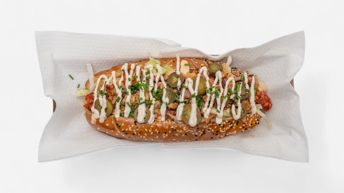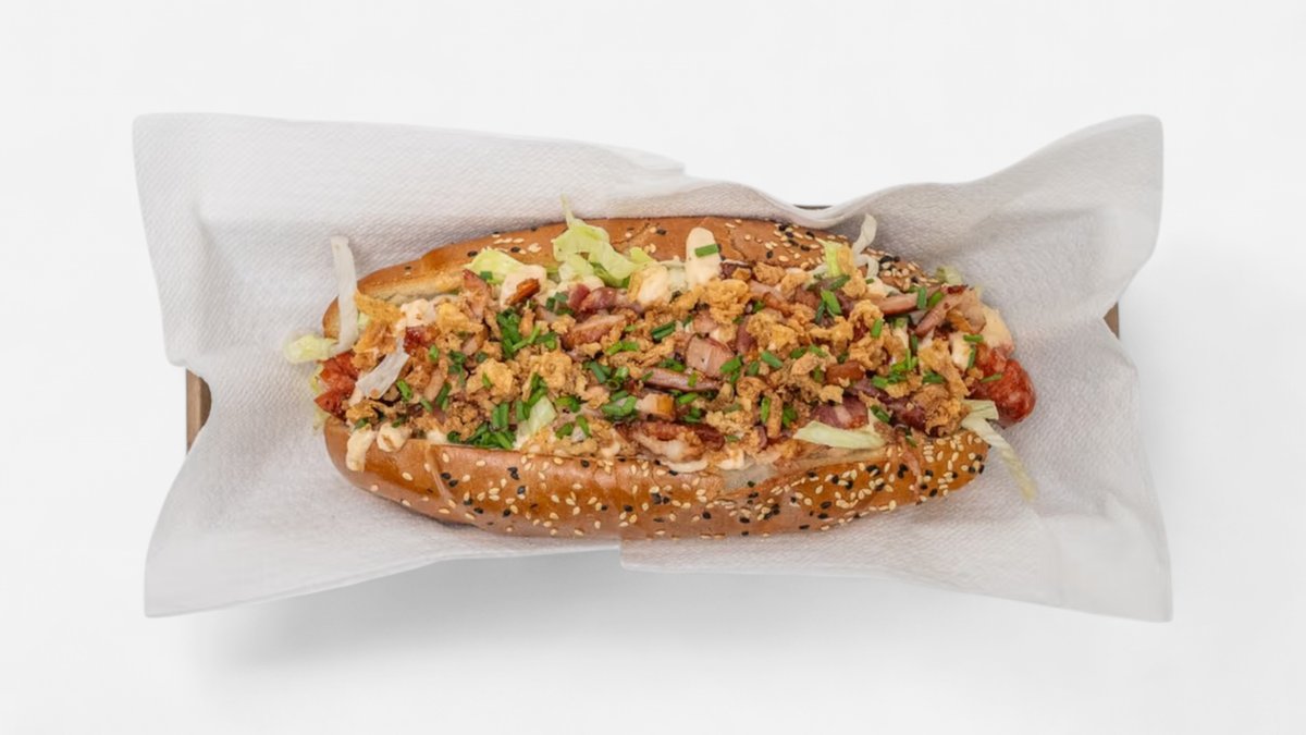 maslový rožok, bravčovo-hovädzí párok, šalát, jalapeňo papričky, chrumkavá slanina , restovaná cibuľa, pažítka 0,24kg / obsahuje: 1,3,7,11 Ilustračná fotka