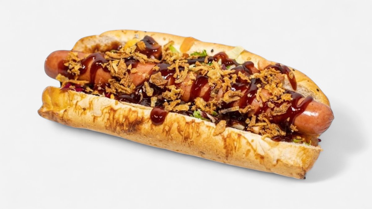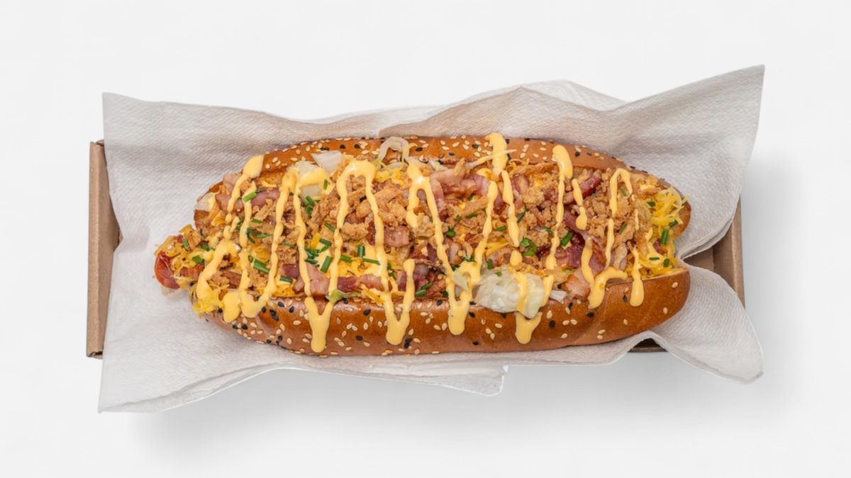 maslový rožok, bravčovo-hovädzí párok, šalát, tekutý cheddar, BBQ omáčka, chrumkavá slaninka, restovaná cibuľka, pažítka 0,24kg / obsahuje: 1,3,7,11 Ilustračná fotka