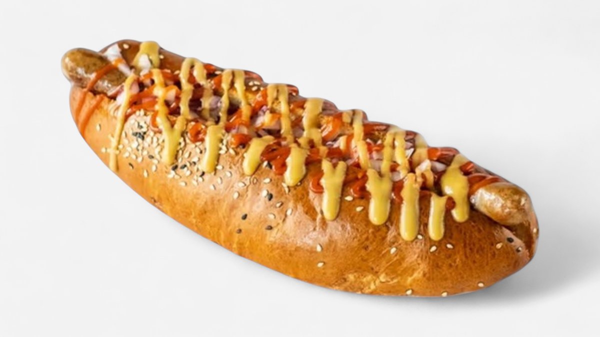 maslový rožok, bravčovo-hovädzí párok, omáčka podľa výberu 0,24kg / obsahuje: 1,3,7,11 Ilustračná fotka
