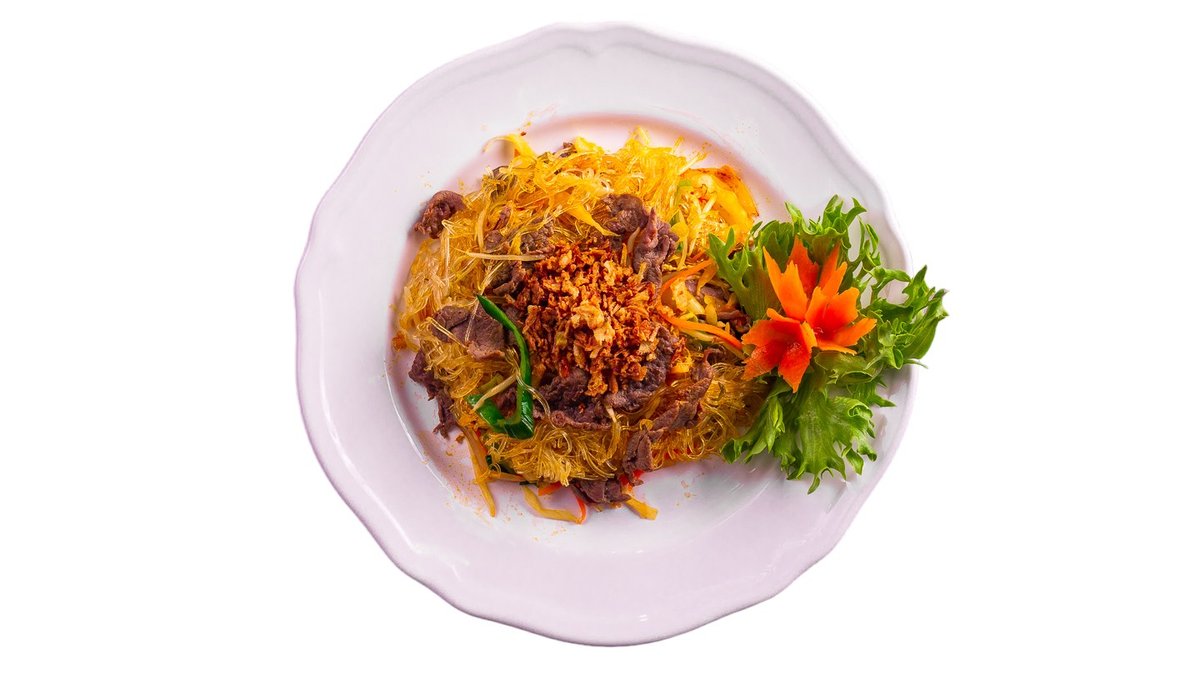 Kórejské/sklenené rezance, šalát, uhorka, mrkva, kaleráb, sójové klíčky, arašidy a chrumkavá cibuľka, bylinky (coriander, mäta), rybia omáčka. Chrumkavá kačica. /Alergény: 2,4,5,6/
