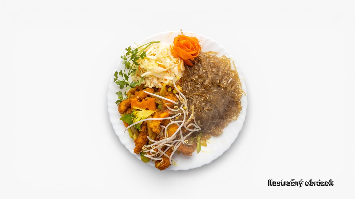 Kórejské/sklenené rezance, šalát, uhorka, mrkva, kaleráb, sójové klíčky, arašidy a chrumkavá cibuľka, bylinky (coriander, mäta), rybia omáčka. Chrumkavé kura. /Alergény: 2,4,5,6/