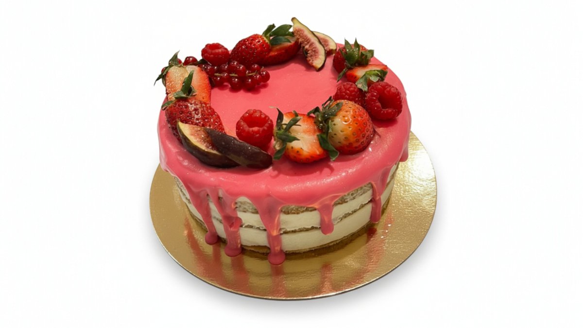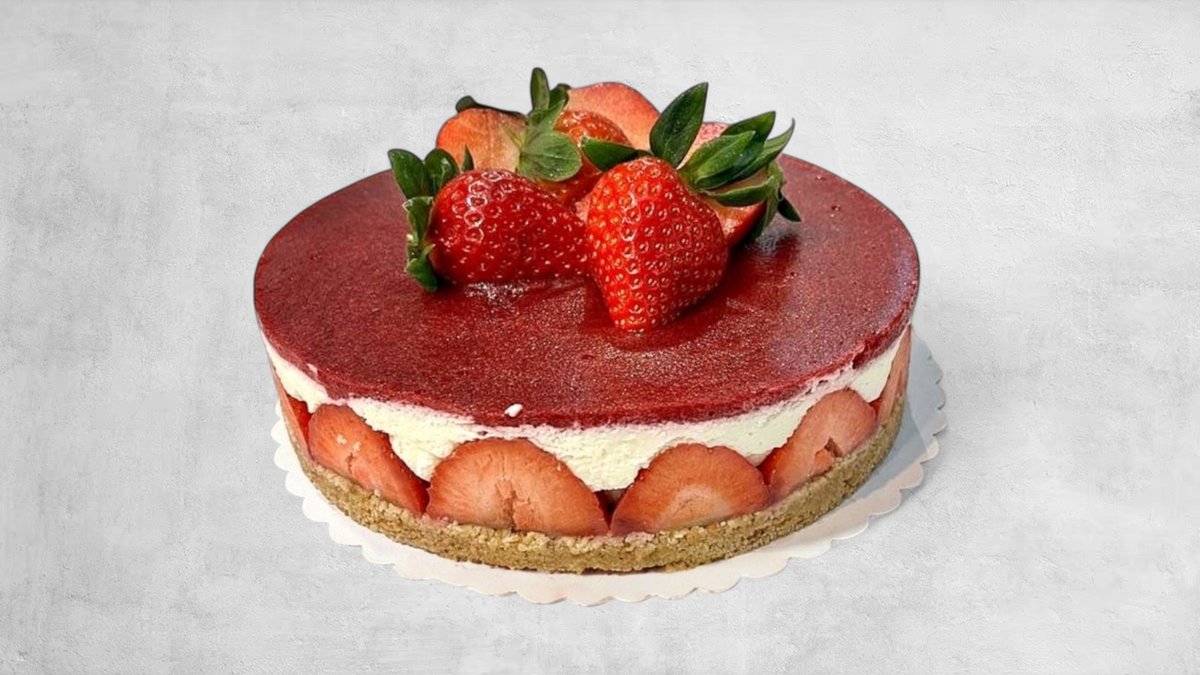 ľahký nepečený cheesecake s jahodami, krémovým syrom a bielou čokoládou. 1000g /1,7