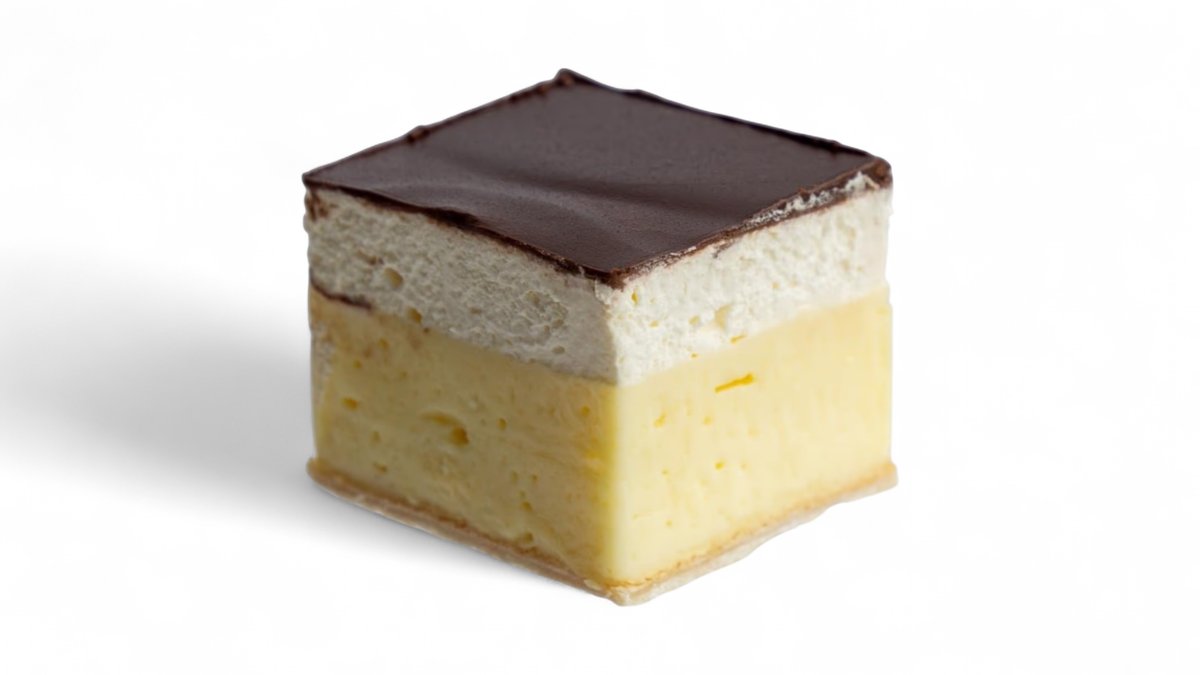 pripravený z domáceho maslového lístkového cesta, s nadýchaným pudingovým krémom s pravou vanilkou, šlahačkou a čokoládovou polevou 115g / obsahuje: 1,3,7