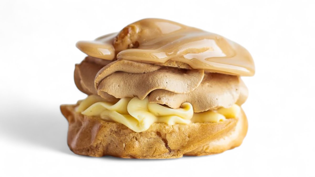 klasický veterník z odpaľovaného cesta s vanilkovým krémom a karamelovou šľahačkou 95g / obsahuje: 1,3,7
