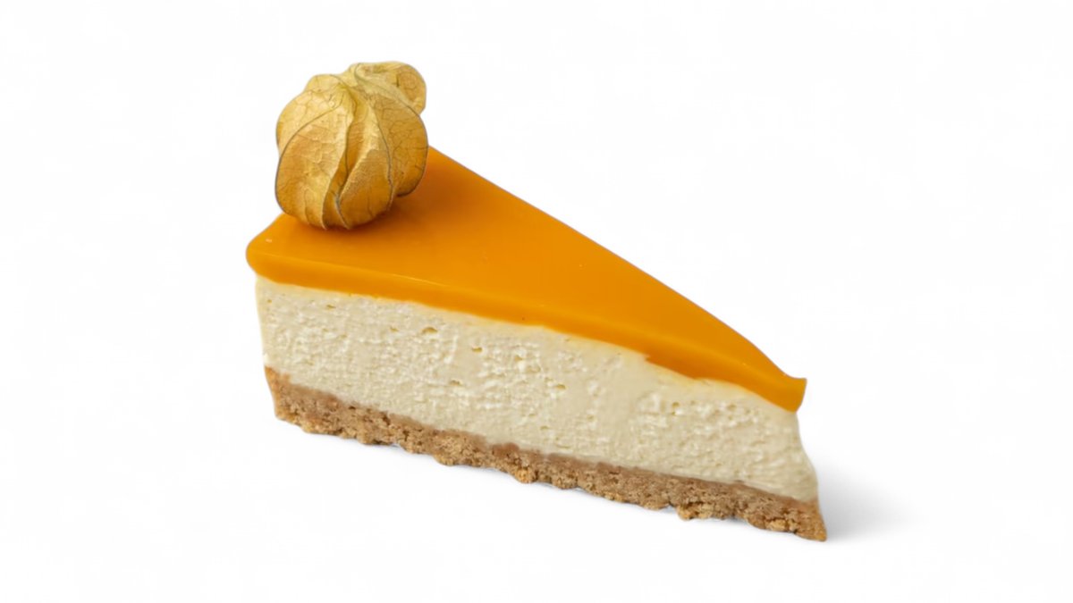 ľahký nepečený cheesecake s krémovým syrom, bielou čokoládou a šľahačkou, passion fruit pyré, physalis 140g / obsahuje: 1,7