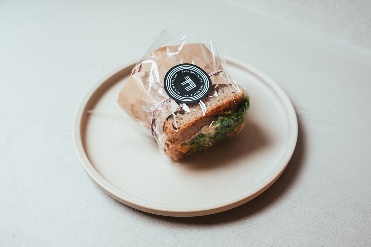 Kváskový sendvič s vegánskou majonézou, pečená paradajka , listová zelenina.