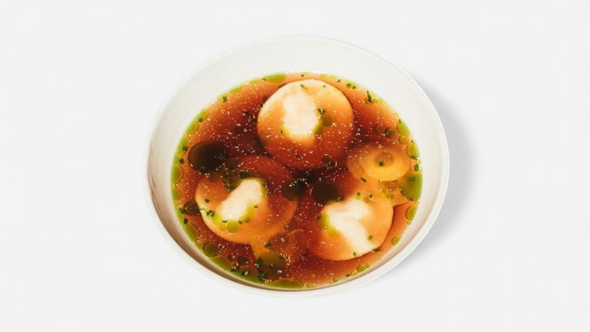 Kačací vývar, ravioli plnené zeleninou, mrkva, pažítka