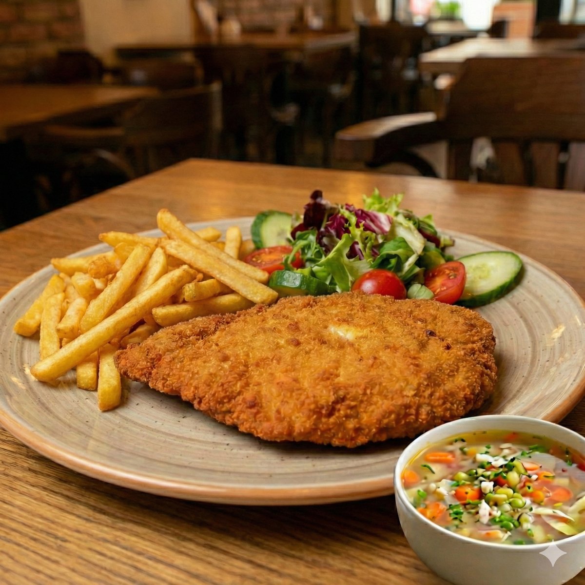 menu 4 Kuraci rezen s hranolkami + Polievka podla dennej ponuky