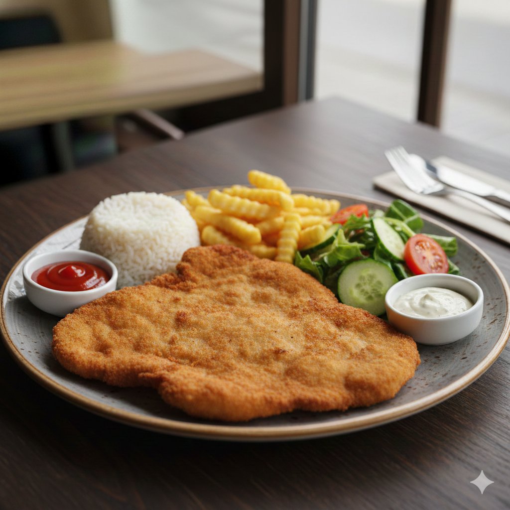 Vyprážané bravcove prsia s ryžou alebo hranolkami, zeleninou a omáčkou podľa výberu. 350 g / obsahuje: 1,3,7