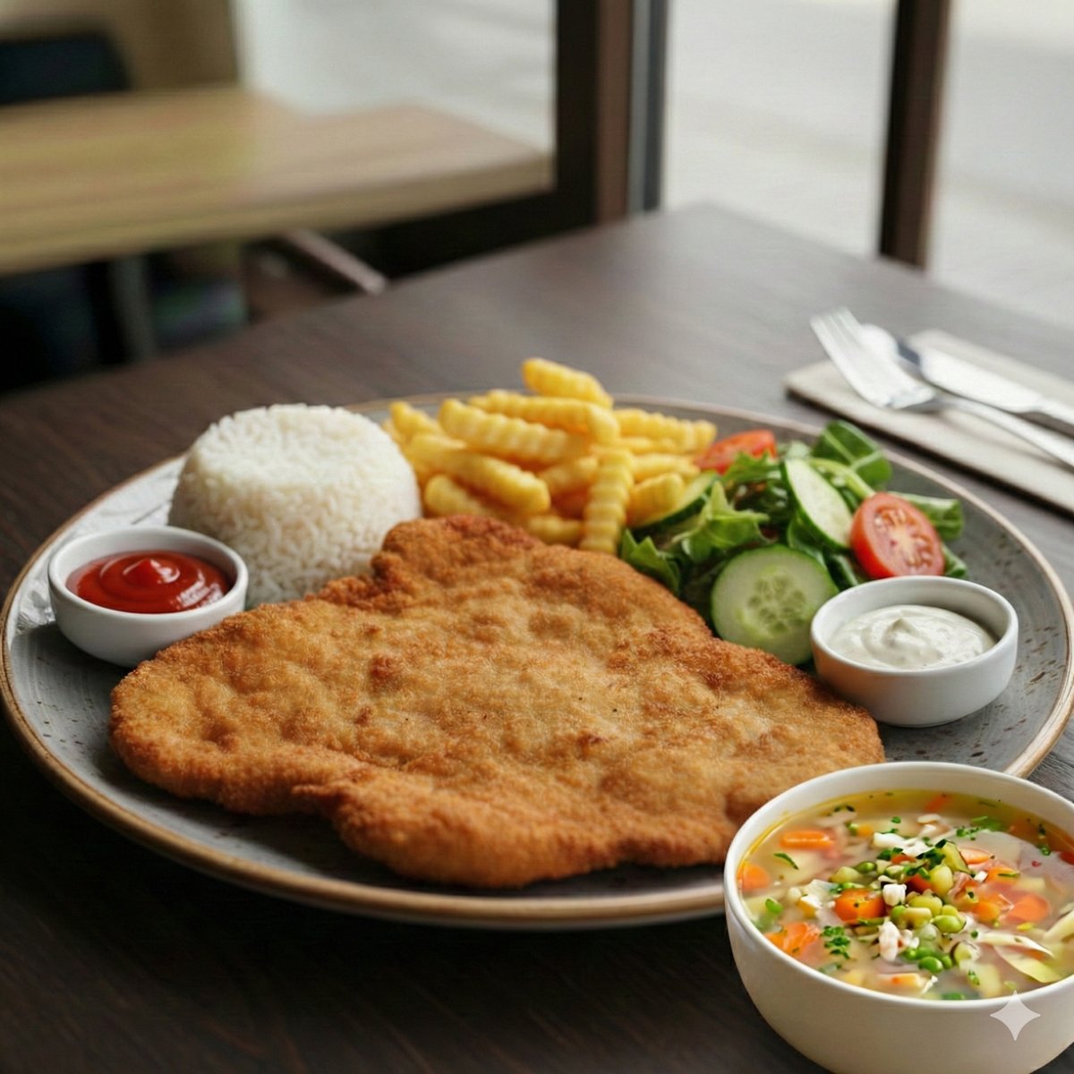 Vyprážané kuracie prsia s ryžou alebo hranolkami, zeleninou a omáčkou podľa výberu. 500 g / obsahuje: 1,3,7