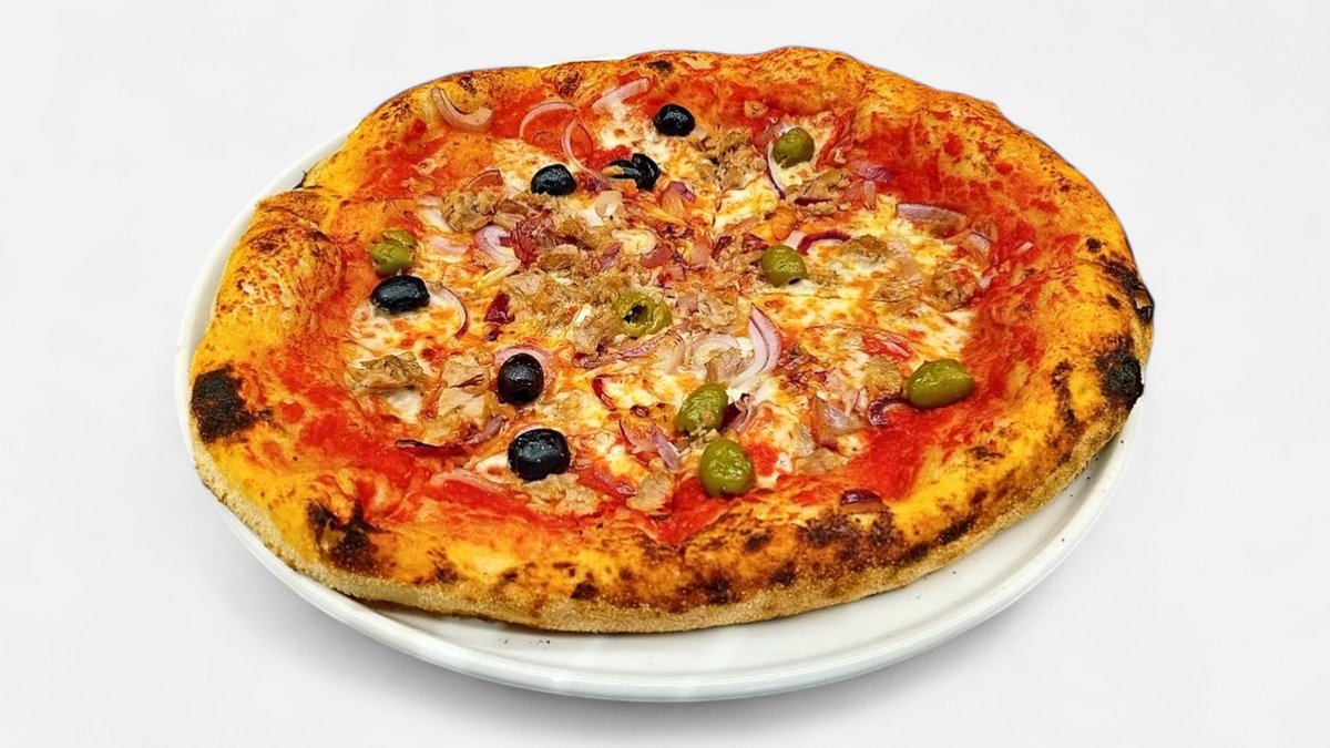 paradajkový základ, mozzarella, tuniak, olivy, červená cibuľa, bazalka, parmezan 530 g / obsahuje: 1,4,7