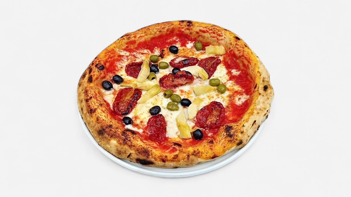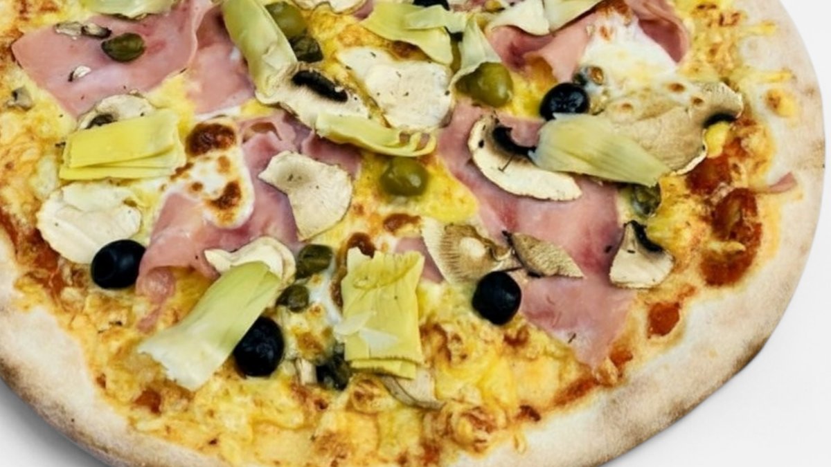 paradajkový základ, mozzarella, šampiňóny, olivy, šunka, artičoky, parmezán 600 g / obsahuje: 1,7