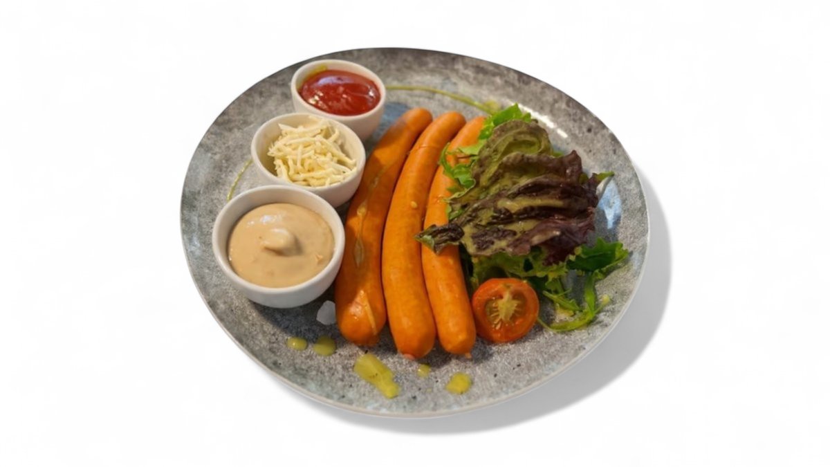 párky, fazuľa v paradajkovej omáčke, grilované šampiňóny, slanina, volské oko, kváskový chlieb 200g / obsahuje: 1,3,7
