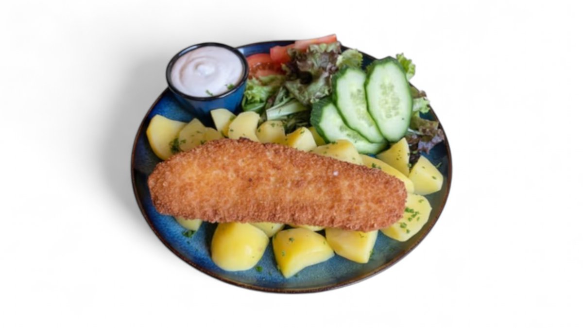 Vyprážané kuracie stripsy (3ks), varené zemiaky, domáca tatárska omáčka