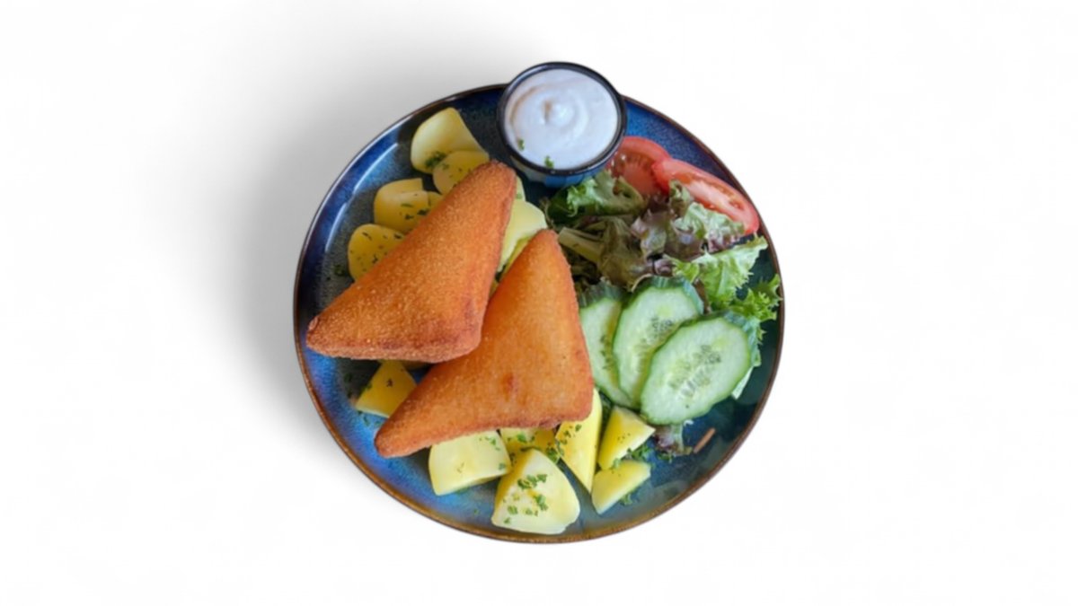 Vyprážaný syr, varené zemiaky, domáca tatárska omáčka