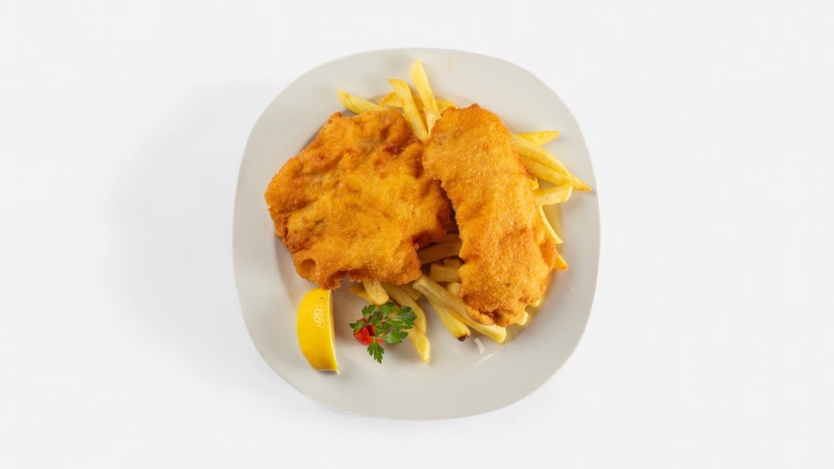 Vyprážaný rezeň, hranolky, dresing