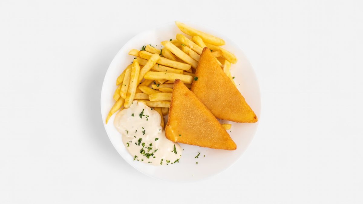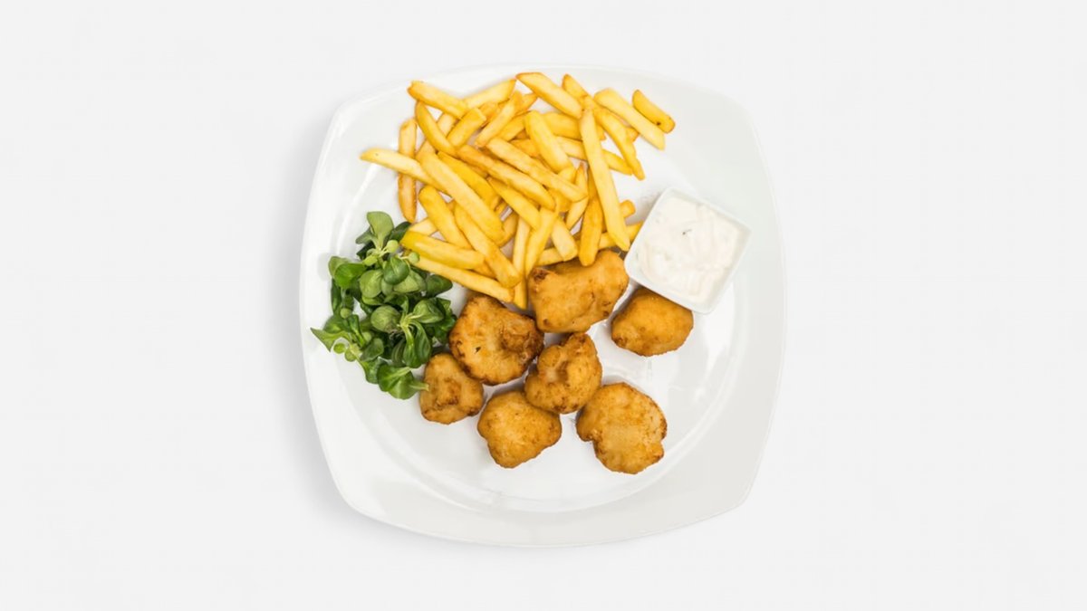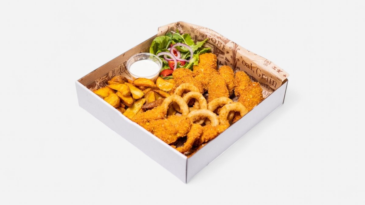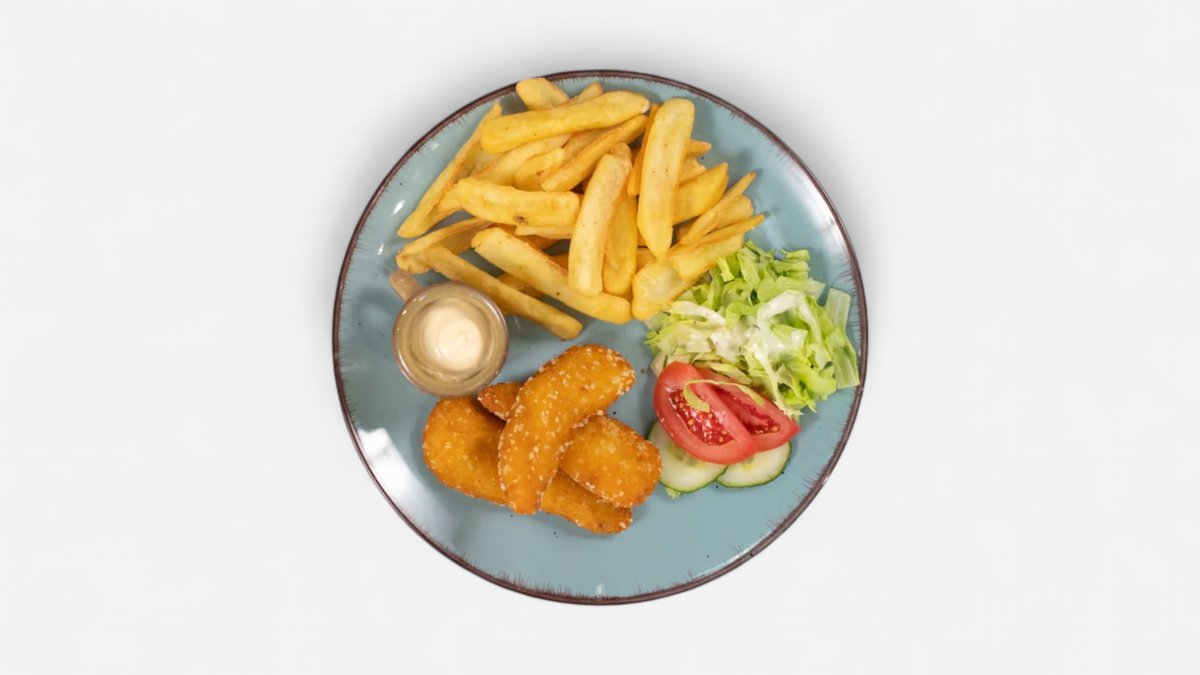 Stripsy, hranolky, dresing, obloha
