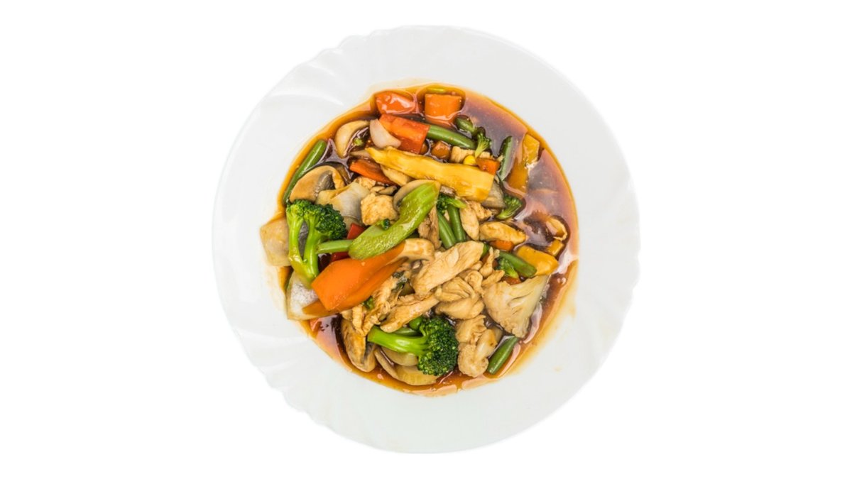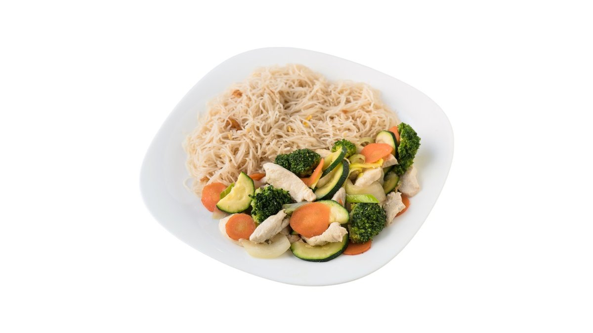 cibuľa, cuketa, bambus, brokolica, mrkva, arašidová omáčka, šampión, chrumkava kura, ryža 300g / obsahuje: 5,6