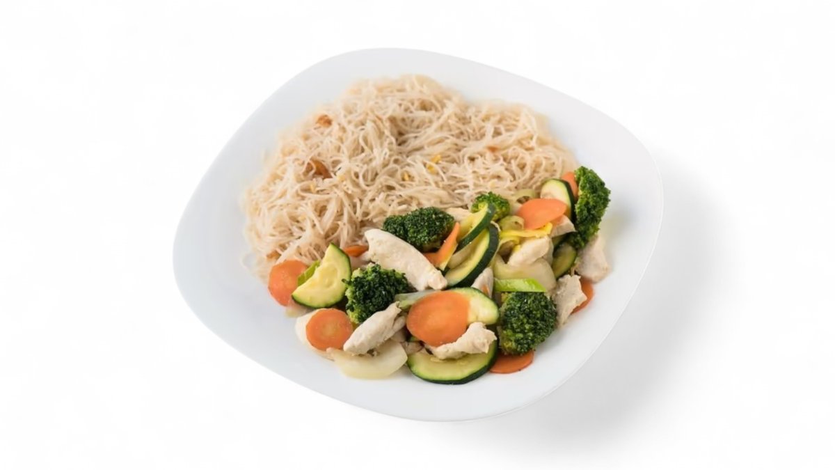 Opekané tenké ryžové rezance, cuketa, mrkva, brokolica, sójové klíčky, + kurací vývar, jarná cibuľa, kuracie mäso