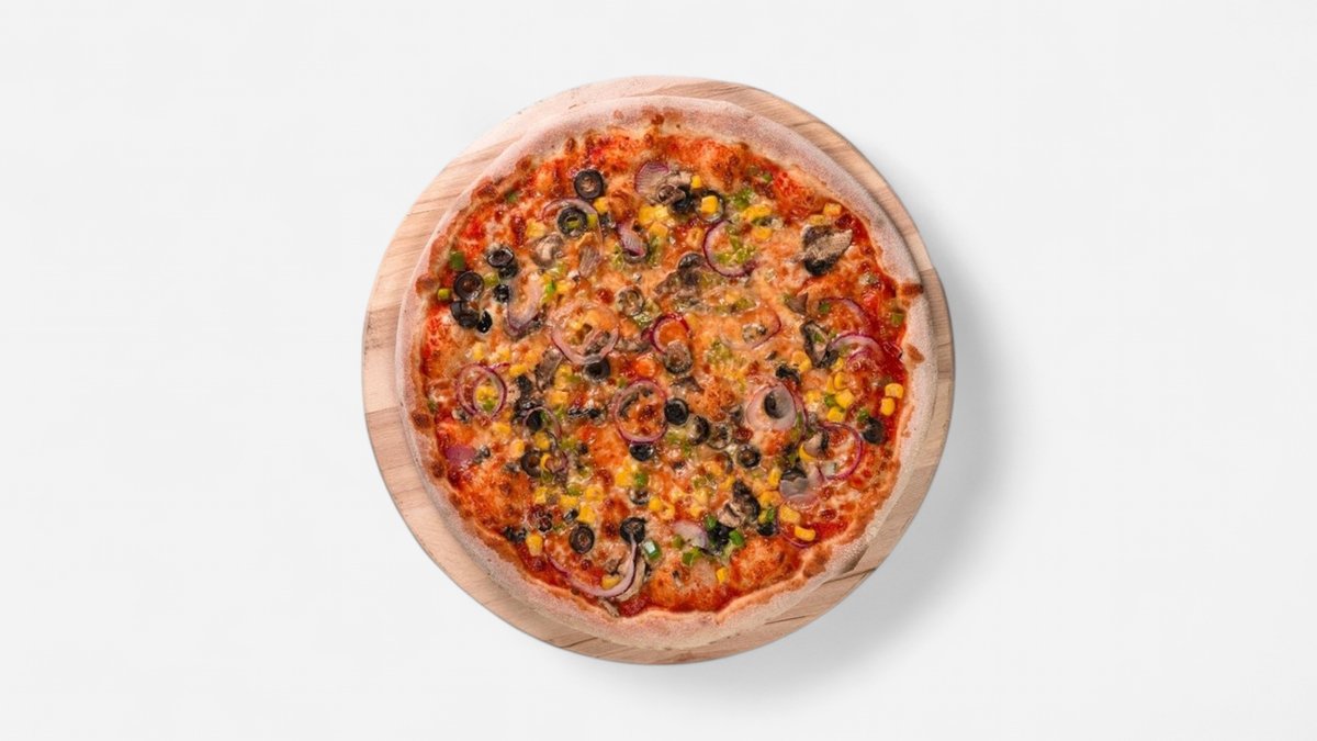 Paradajkový základ, syr, šampiňóny, kukurica, cibuľa, paradajka, olivy 400g / obsahuje: 1,3,7