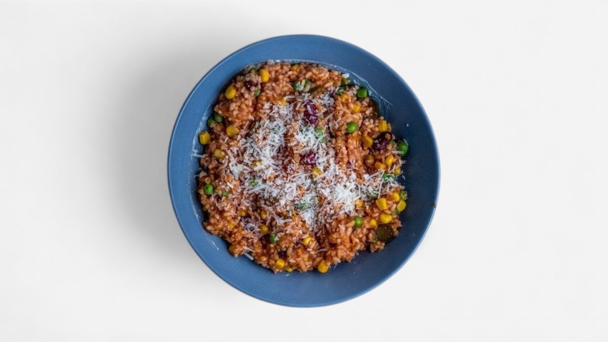 Rýža, paradajkový základ, fazuľa, chilli, kukurica, parmezán