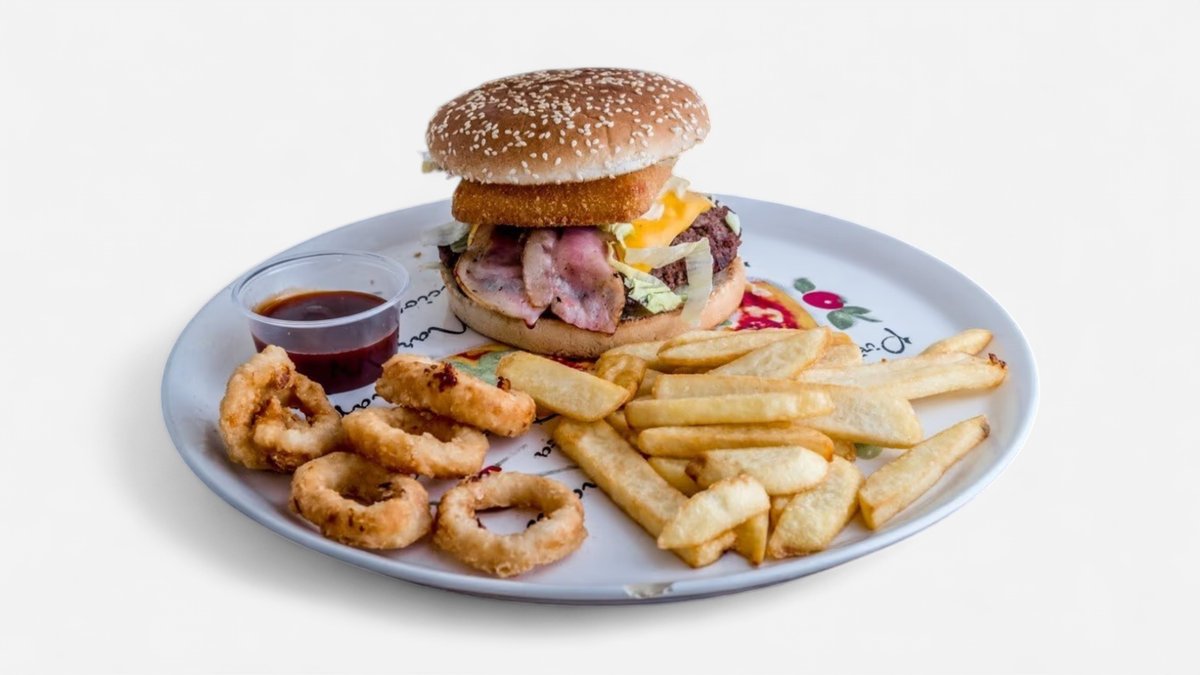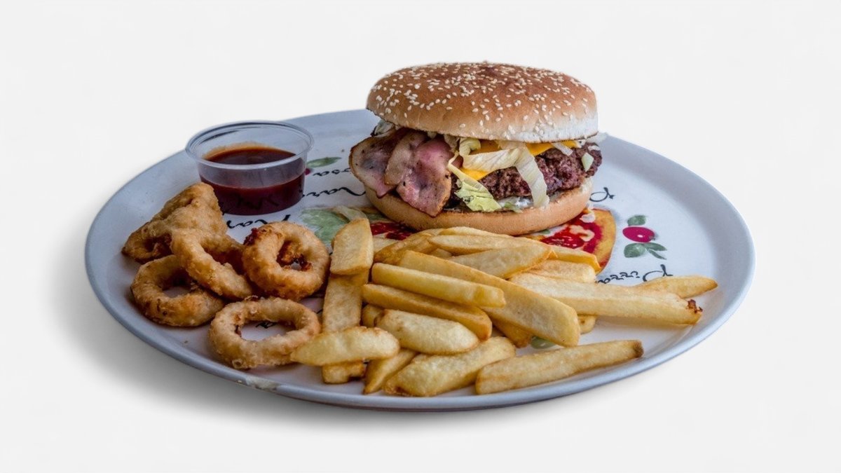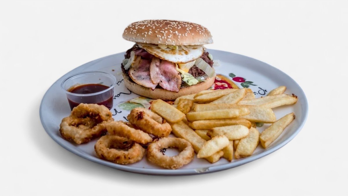 Žemla, hovädzie mäso, slanina, cheddar, volské oko, šalát, sterilizovaná uhorka, majonéza, cibuľová & BBQ omáčka, hranolky, cibulové krúžky