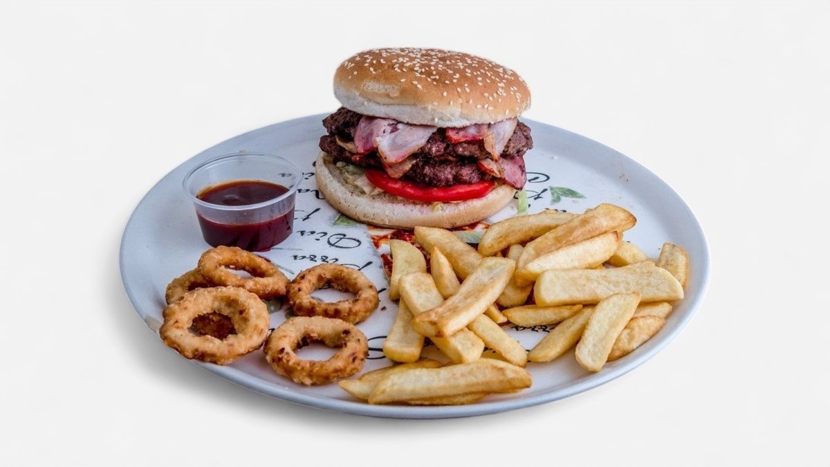 Žemla, 2x hovädzie mäso, 2x slanina, 2x cheddar, paradajka, šalát, červená cibuľa, sterilizovaná uhorka, majonéza, cibuľová & BBQ omáčka, hranolky, cibulové krúžky