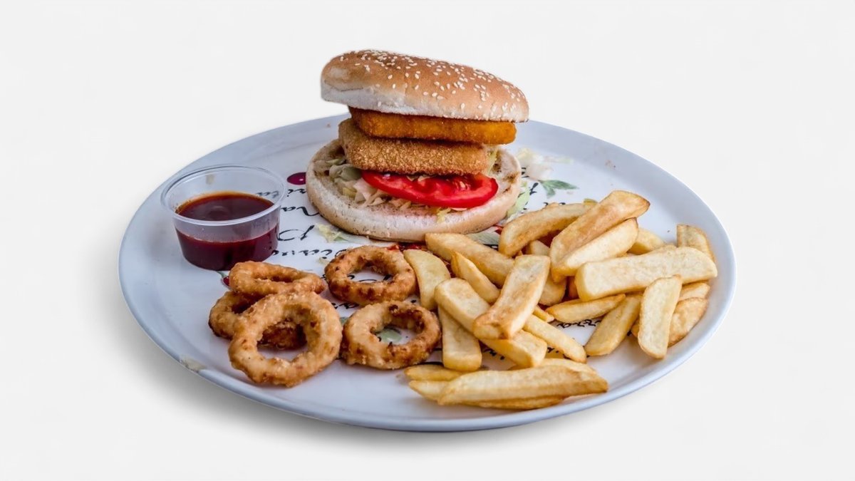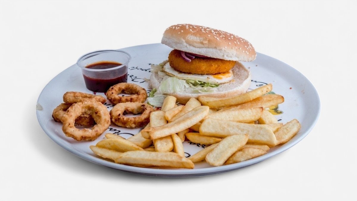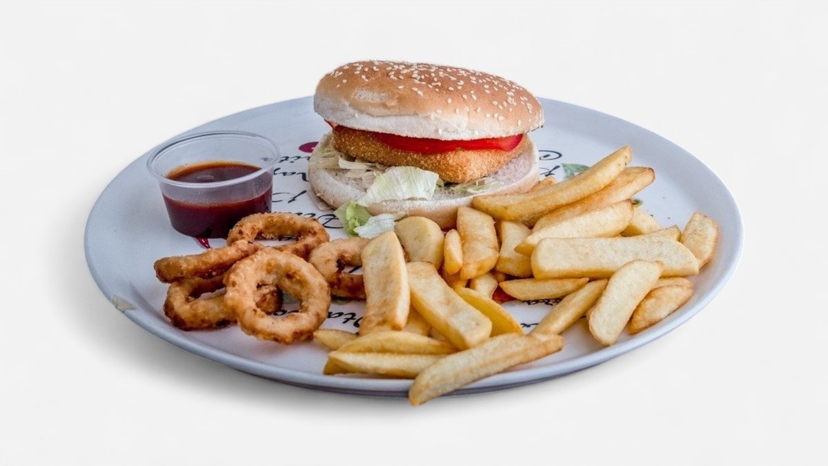 Žemla, 2x vyprážaný syr, šalát, paradajka, majonéza, hranolky, cibulové krúžky