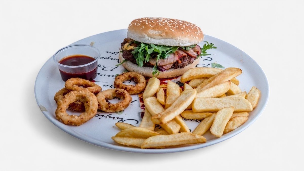 Žemla, cheddar, hermelín, volské oko, šalát, paradajka, červená cibuľa, majonéza, cibuľová & BBQ omáčka, hranolky, cibulové krúžky