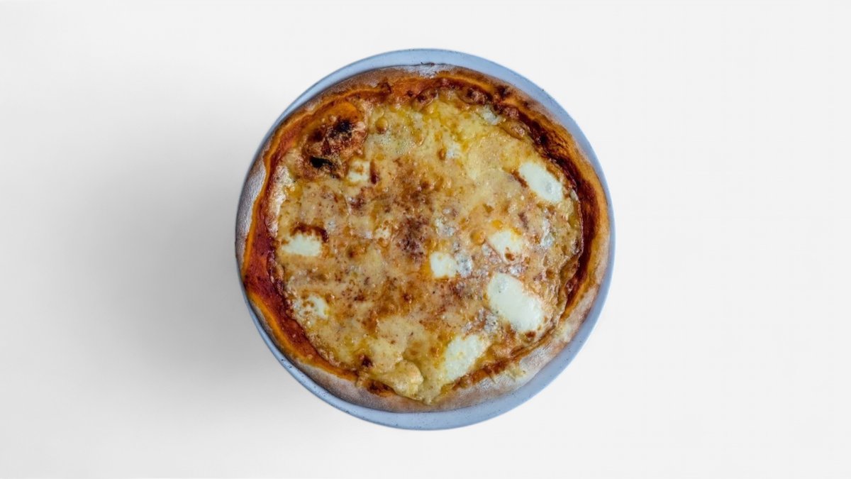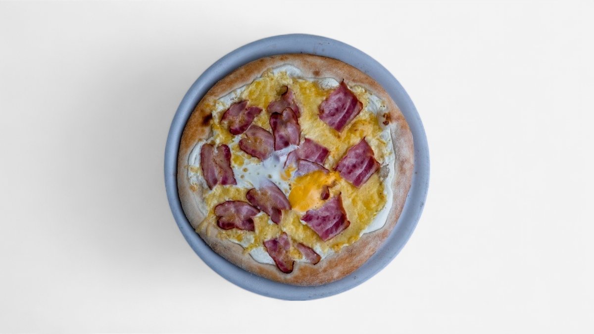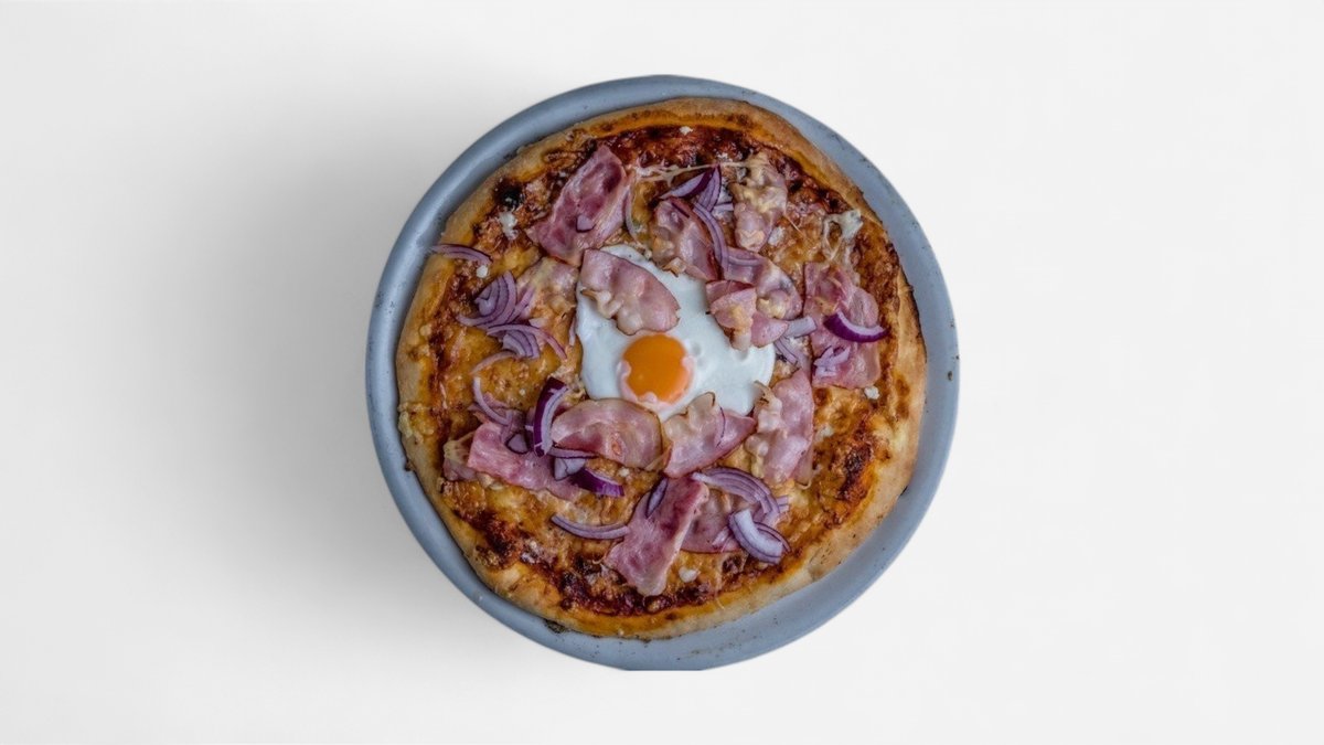 Paradajkový základ ,cheddar plátky ,červená cibuľa ,slanina,syr eidam ,vajce