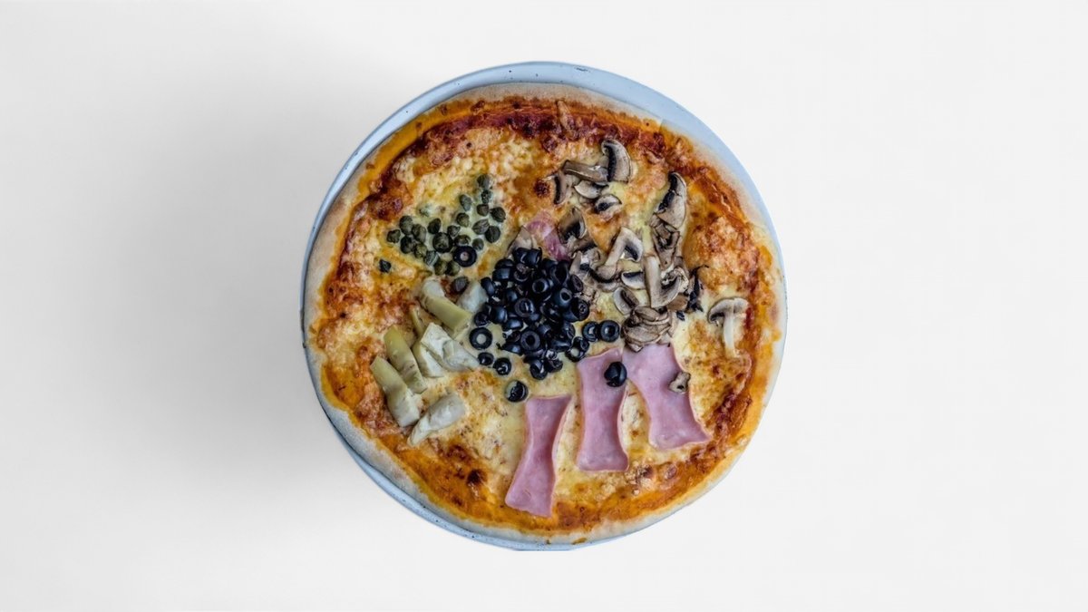 Tomato, eidam, šunka, šampiňóny, olivy, kapary, artičoky