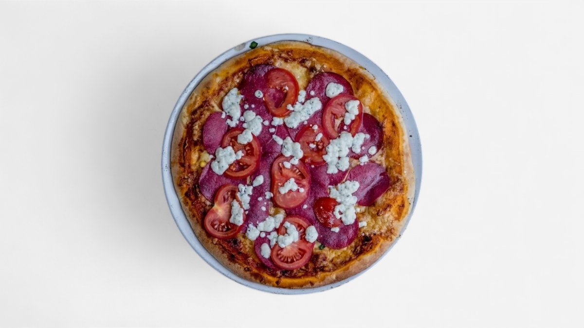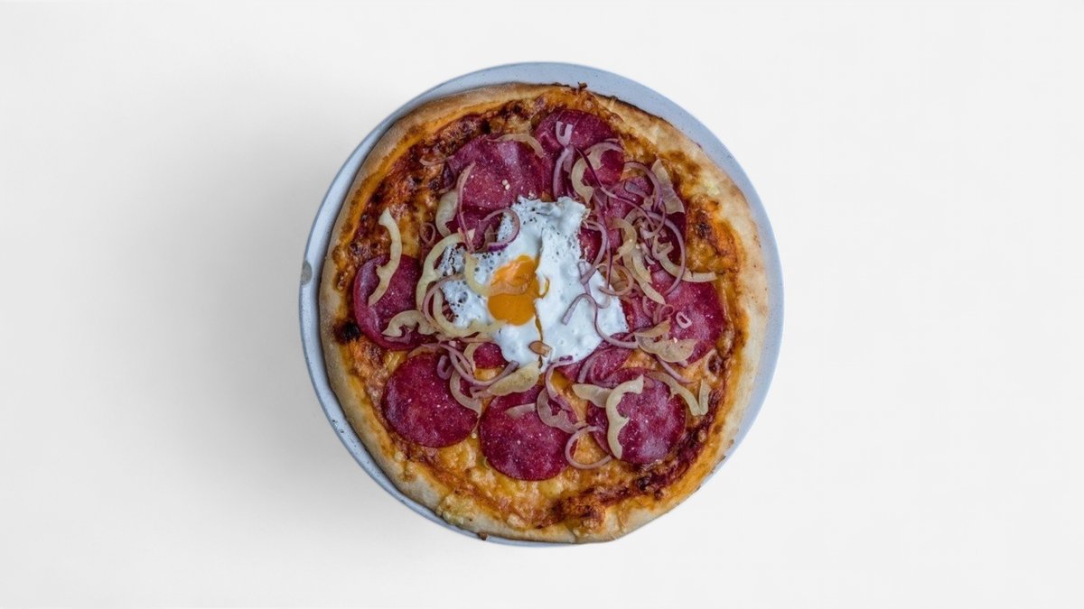 Tomato, eidam, slanina, kukurica, vajce , klobása, Červená cibuľa