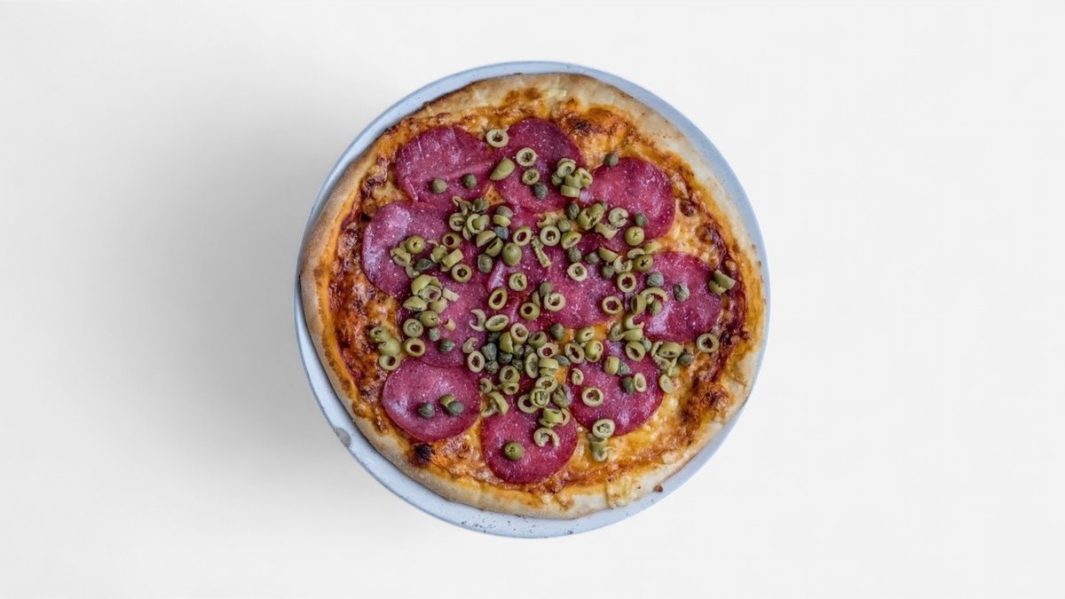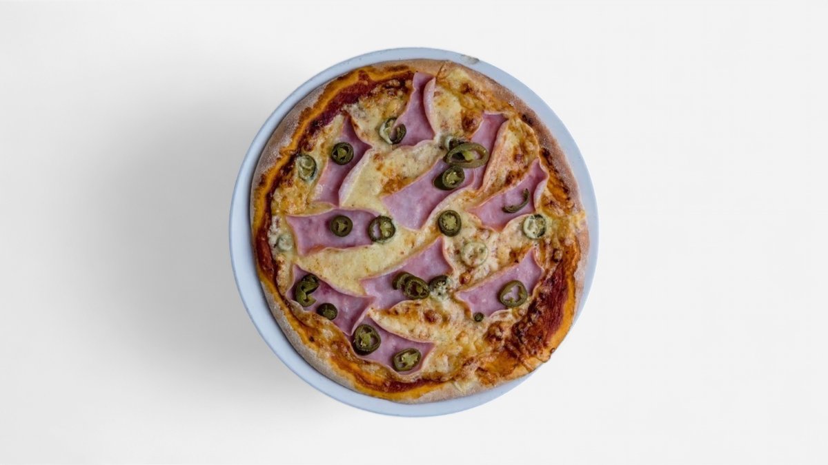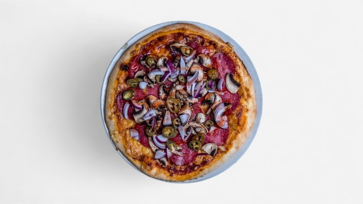 Tomato, eidam, saláma, šampiňóny, feferóny, chilli omácka, cibuľa