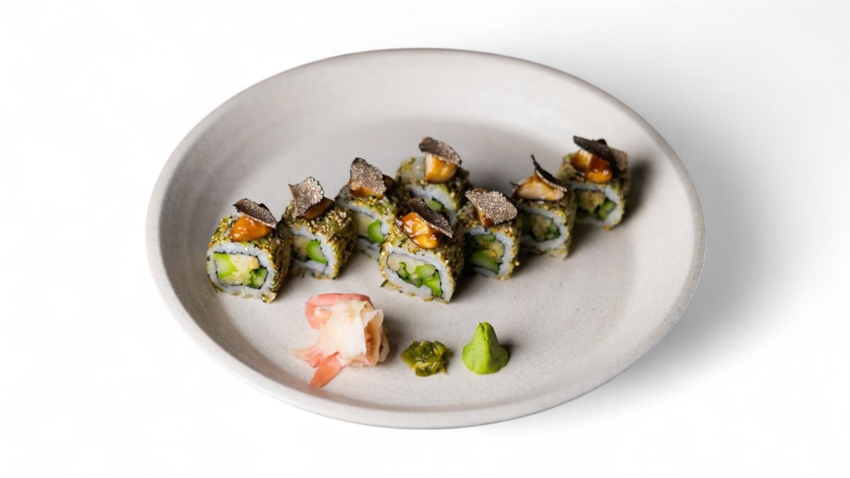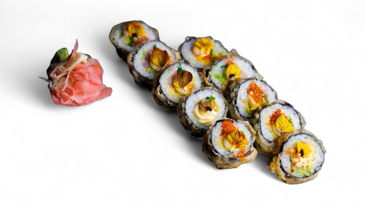 Enoki v tempure, uhorka špargľa, avokádo guacamole, koriander, japonská mayo 200g /1,3,6