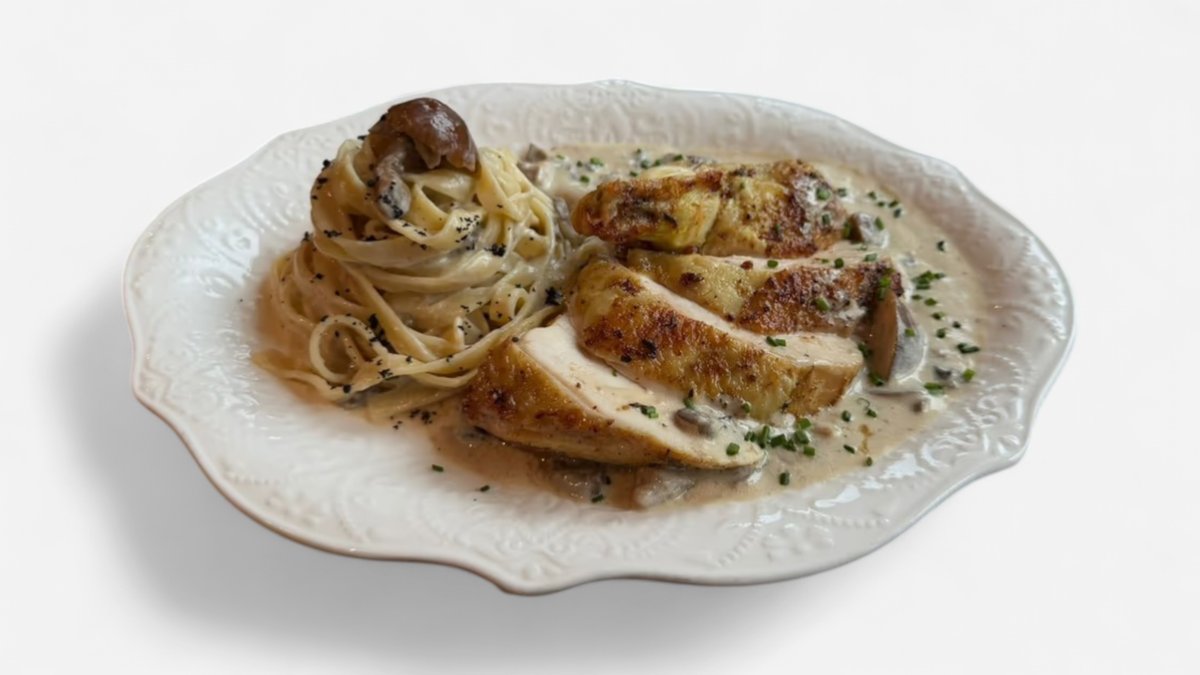 Šťavnatý kurací steak Supreme s chrumkavou kožou, podávaný na hodvábnych tagliatelle v jemnej hubovo-smotanovej omáčke. Dochutené bylinkovým olejom, ktorý celé jedlo prevonia sviežou arómou lesa a čerstvosti, 420 g (1,3,7)