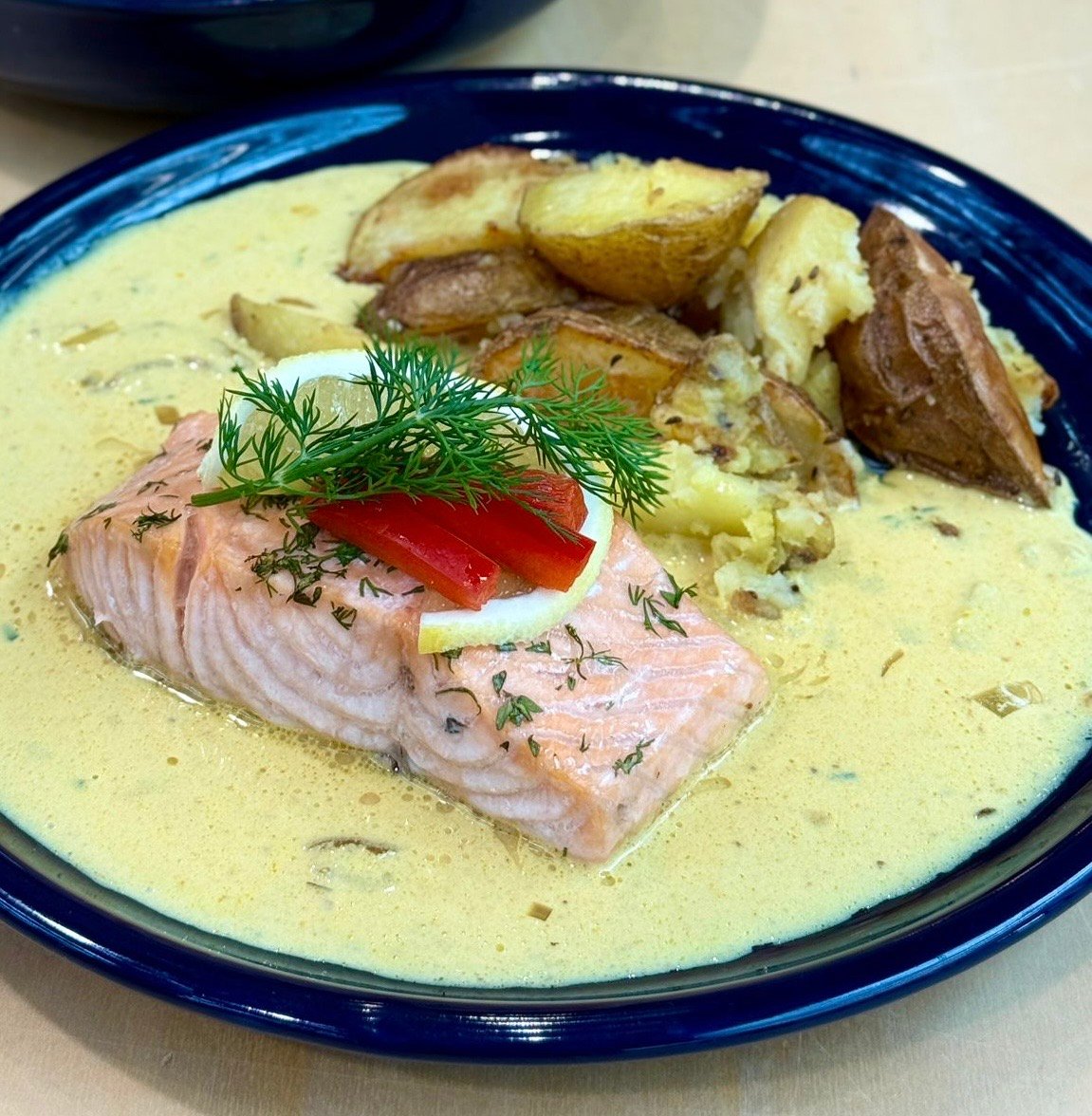 Steak z lososa, citrónová omáčka, opekané zemiaky. (350 g) /1, 4, 7/