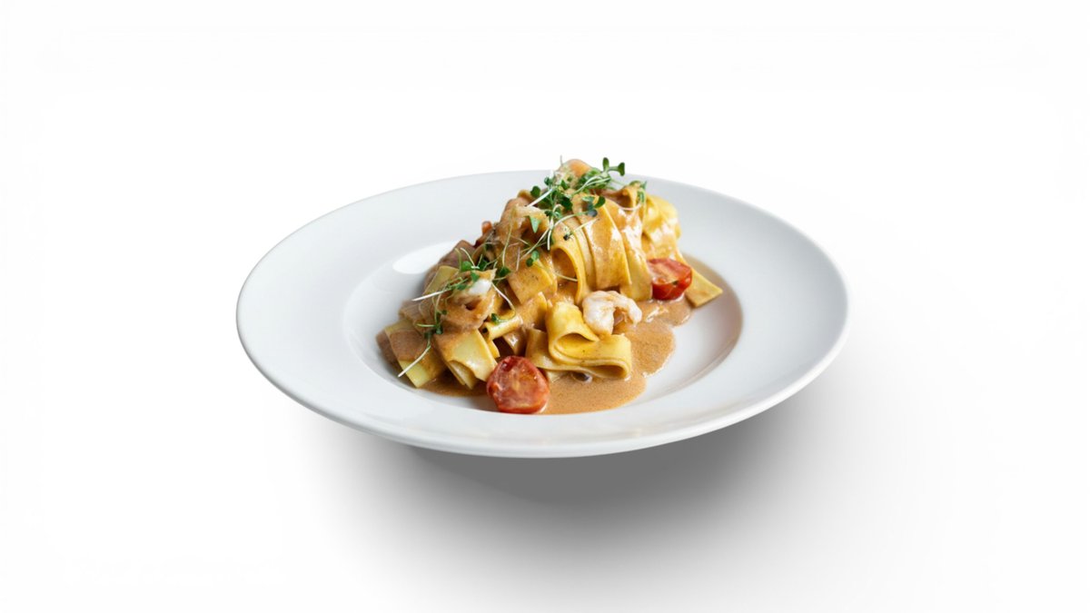 Cestoviny podávané s bohatou, krémovou omáčkou z mäkkýšov a krevetami.