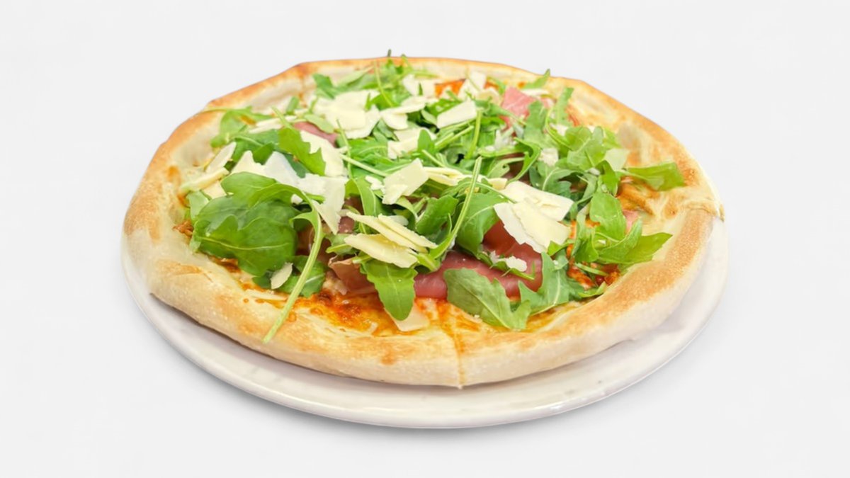 Paradajkový základ,mozzarella,parmská šunka,parmezán,ruccola