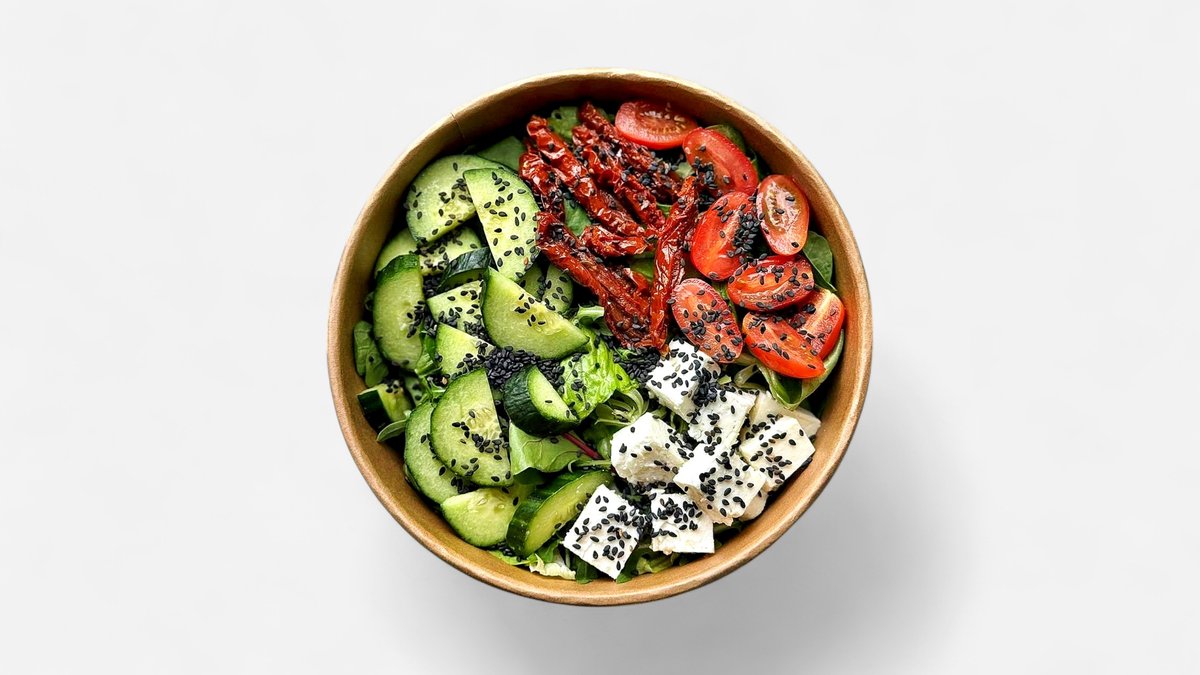Svieži šalát so sušenými paradajkami, cherry paradajkami, medovou zálievkou a balkánskym syrom A:7,10,11 350g 390kcal B:12g, S:15g, T:30g, 3,5g