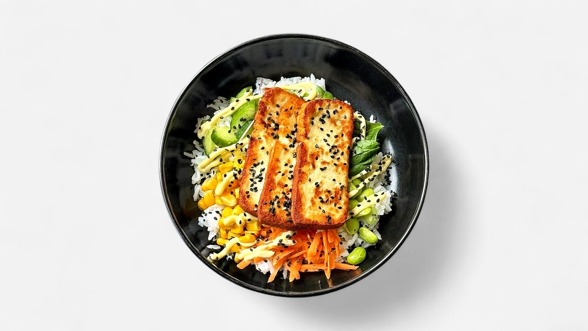 Ryža, grilovaný halloumi syr , sójová omáčka, mrkva, uhorka, sweet-chilli omáčka, kukurica a baby špenát, edamame, japonská majonéza 457kcal B: 19g, S:63g, T: 14g, V:4g 200g, A: 1,6,7, 10,11 (môže obsahovať 5,8)
