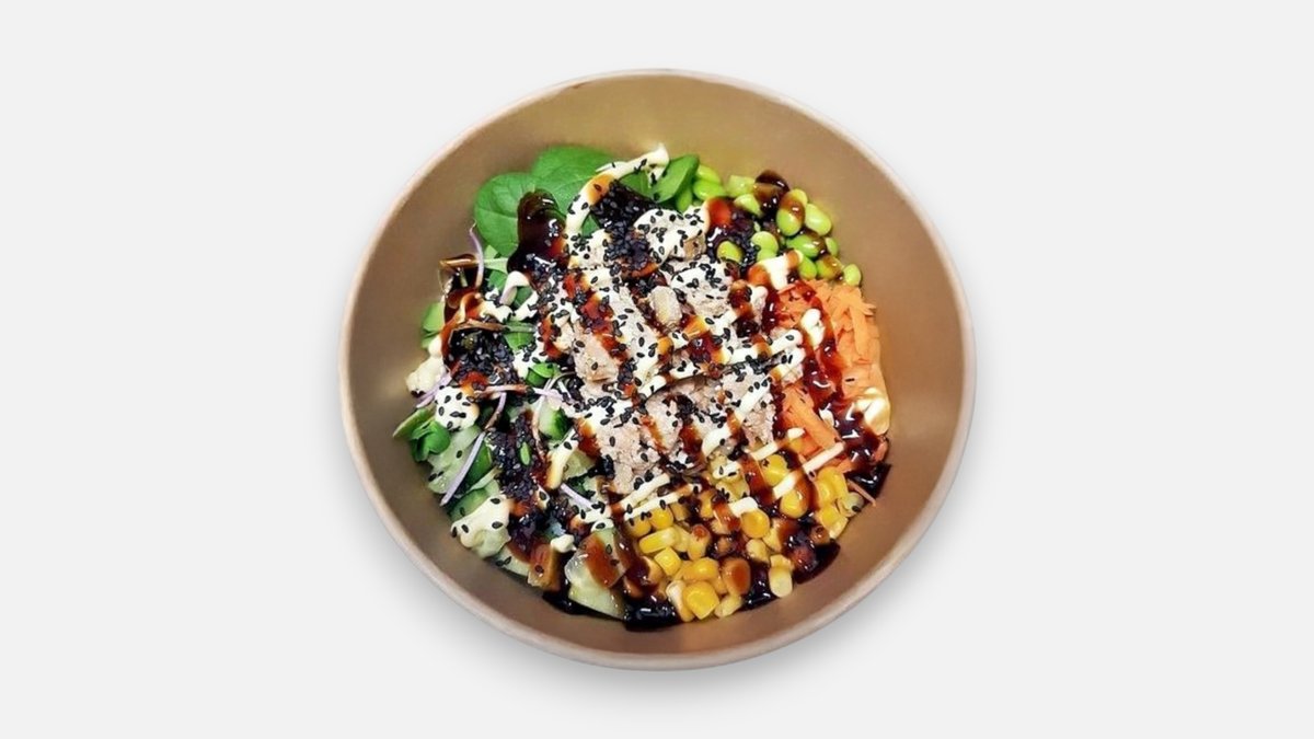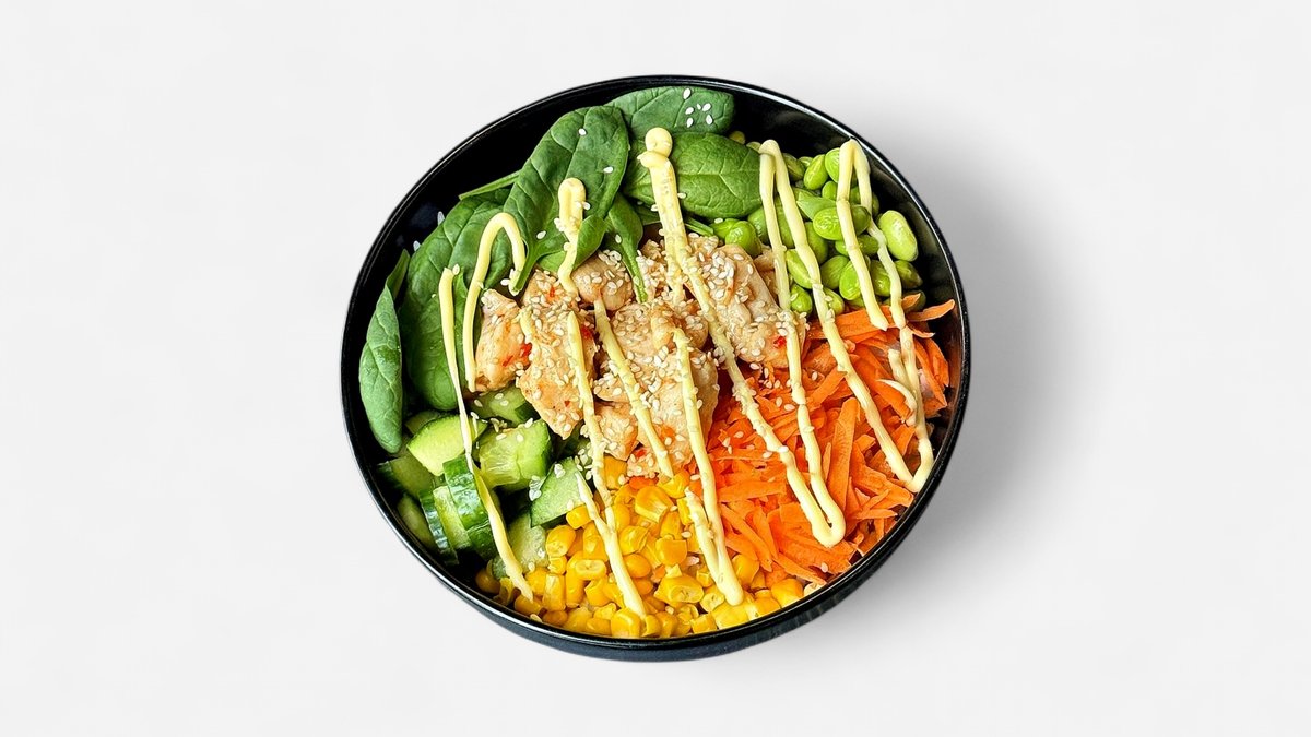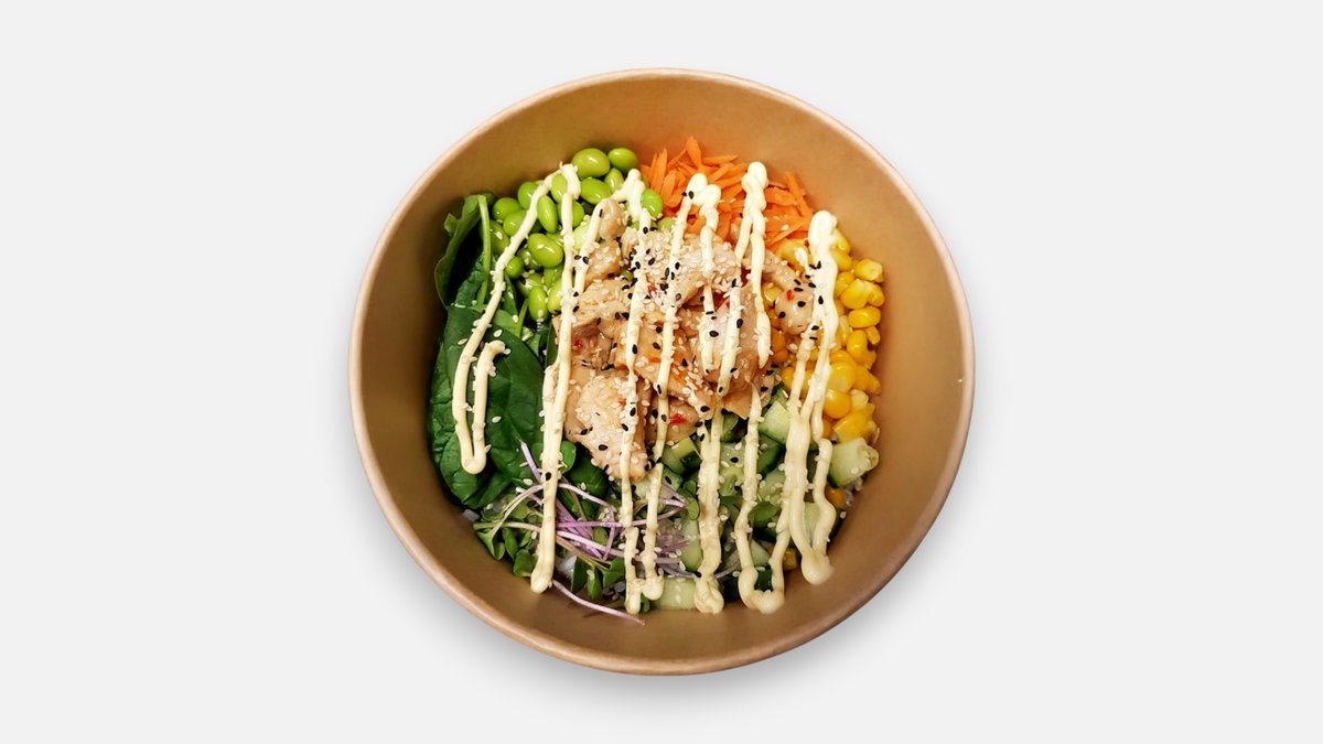 Ryža, grilované kuracie mäso, sójová omáčka, mrkva, uhorka, sweet-chilli omáčka, kukurica a baby špenát, edamame japonská majonéza 400g, A: 1,6,7, 10,11 (môže obsahovať 5,8) 684kcal B:41g, S: 121g, T:3g, V:4g