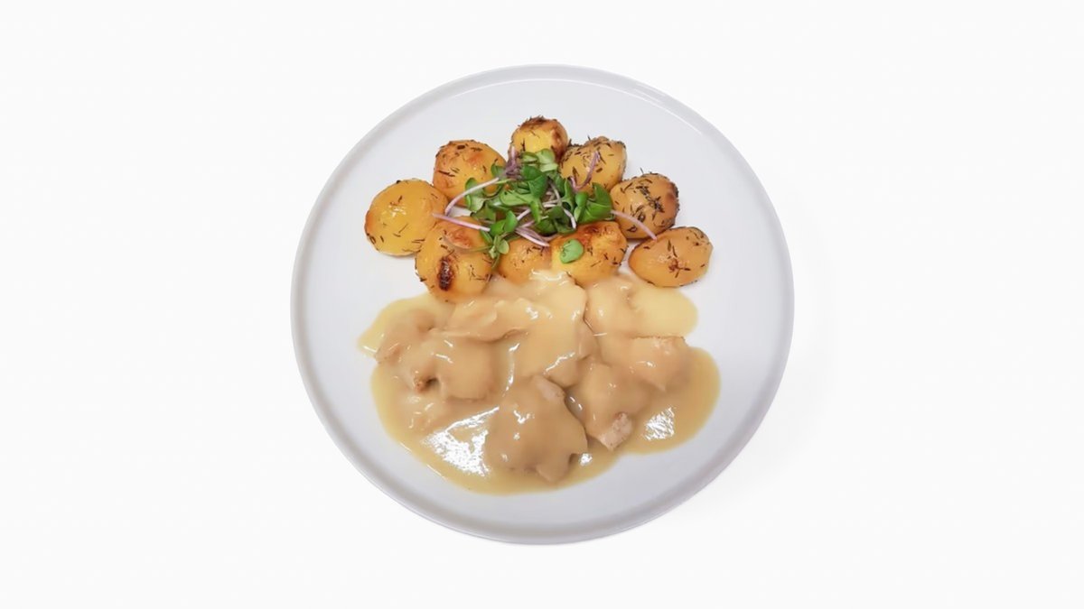 Jemné kuracie kúsky na domácej omáčke s pečenými zemiakmi (A: 10,11) 120/150g 264kcal B: 24g, S:36g, T: 3g, V:2g