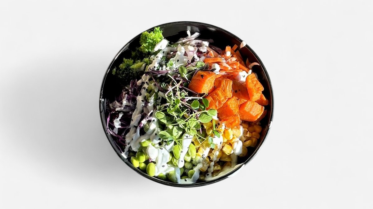 Quinoa, bataty, čínska kapusta, kukurica, mrkva, brokolica, jogurtový dressing 400g, A: 7 420kcal B: 16g, S: 71g, T: 8g, V: 2g