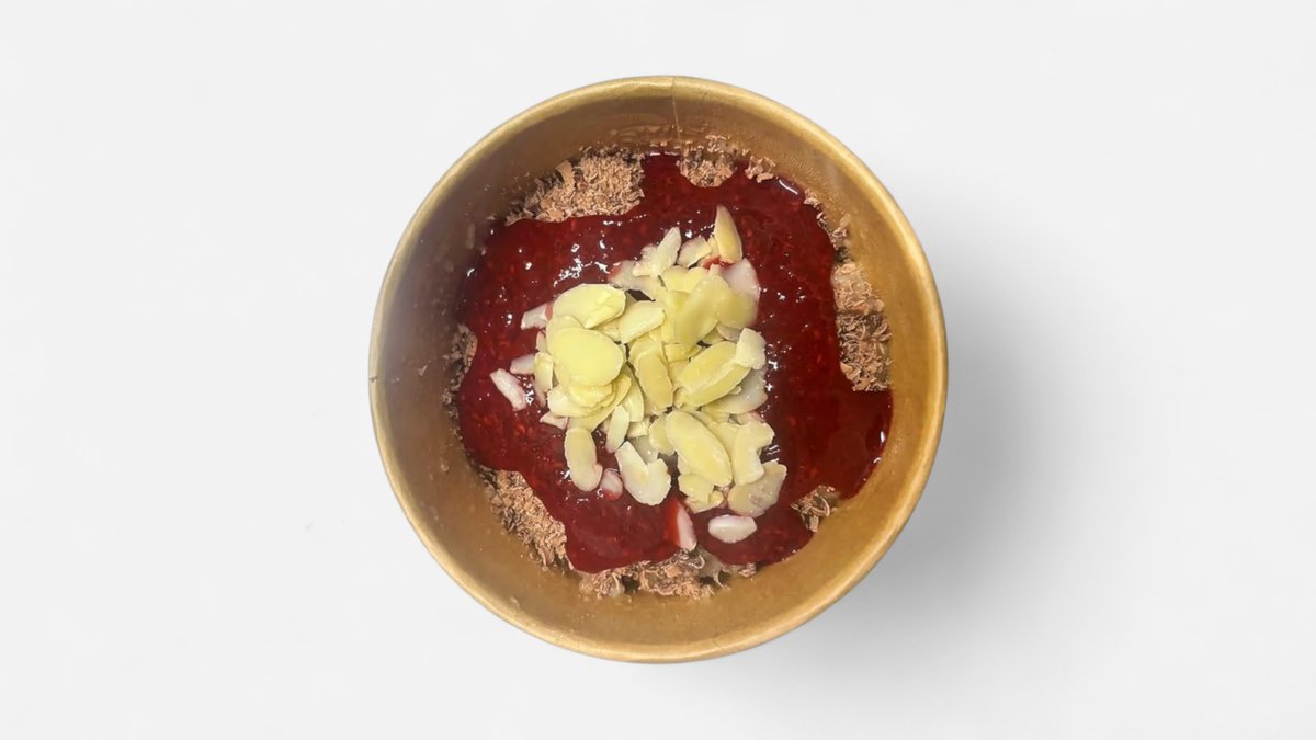 ovsené bezlepkové vločky, kokosový cukor, bezlaktózová čokoláda, chia, škorica, malinová omáčka ALERGÉNY: žiadne Hmotnosť: 350g Skladujte pri 4°C. Výrobok je po otvorení je určený na okamžitú spotrebu. Bez lepku. Bez laktózy. Vegánska 305kcal B:8g/S:52g/T:4g/V:3g