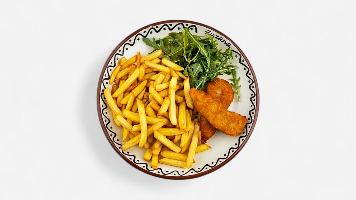 300g mäso, hranolky, ľadový šalát, rajčina, uhorka, cibuľa, desing