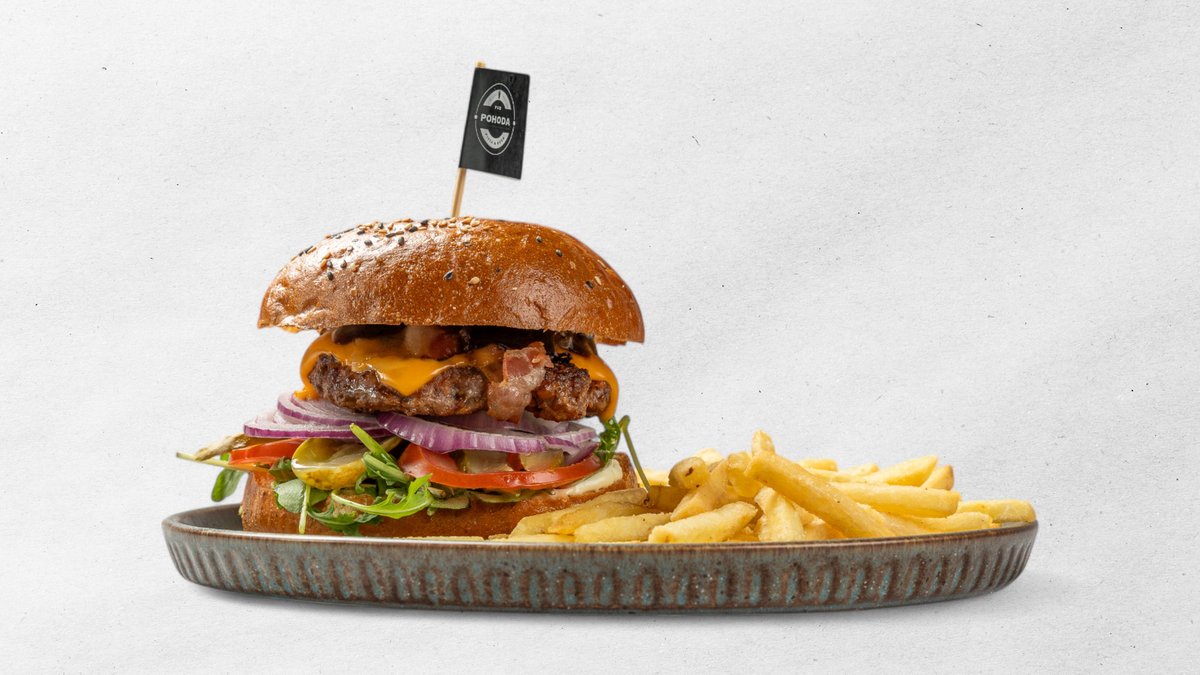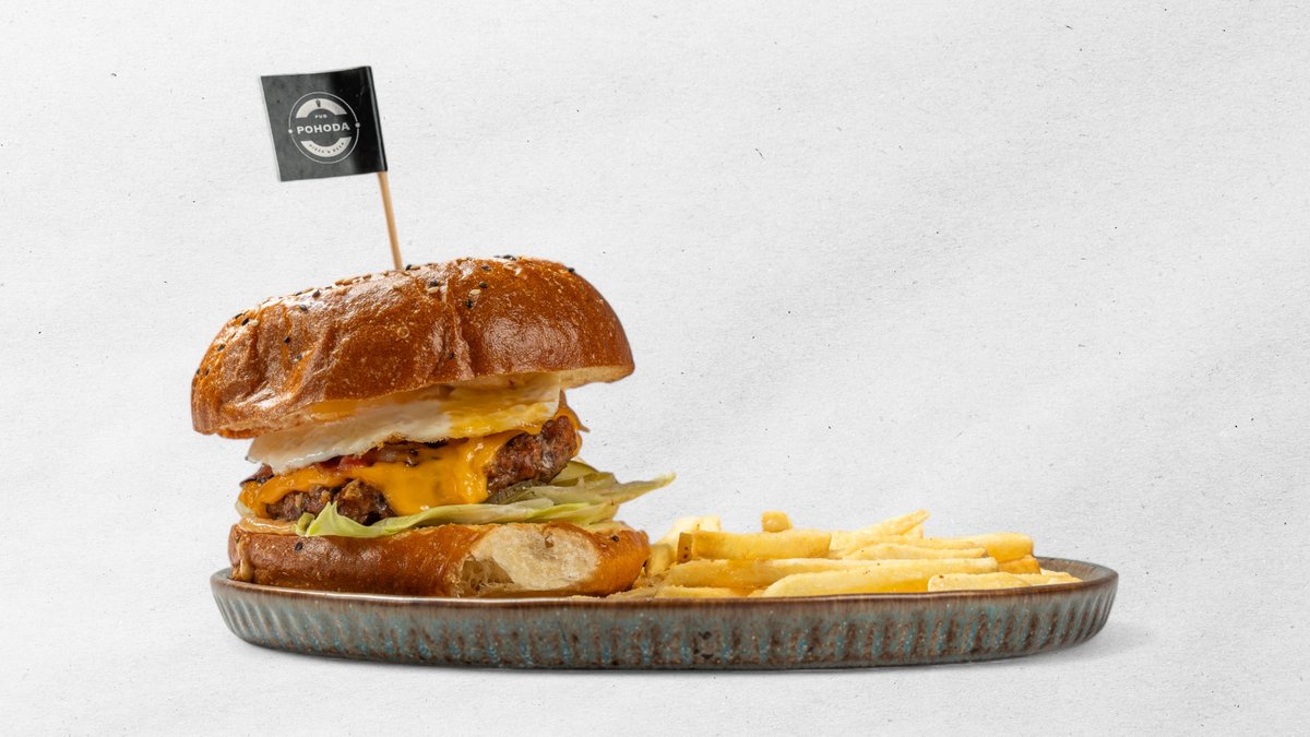 mletý steak s mozzarellou, burger dip, volské oko, cheddar, slanina, ľadový šalát, kyslá uhorka + hranolky 100 g 445 g / obsahuje: 1, 3, 7, 10, 11