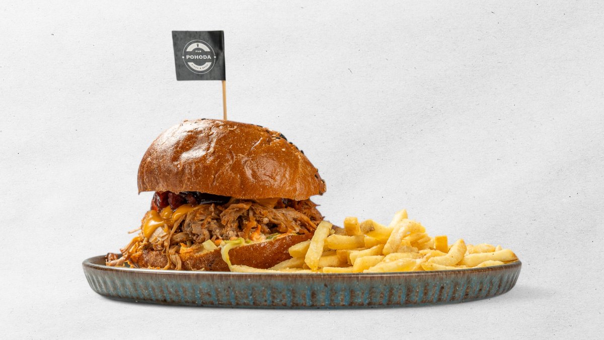 trhané bravčové mäso, majonéza, cibuľové chutnay, cheddar, coleslaw šalát, BBQ omáčka + hranolky 100 g 465 g / obsahuje: 1, 3, 7, 10, 11