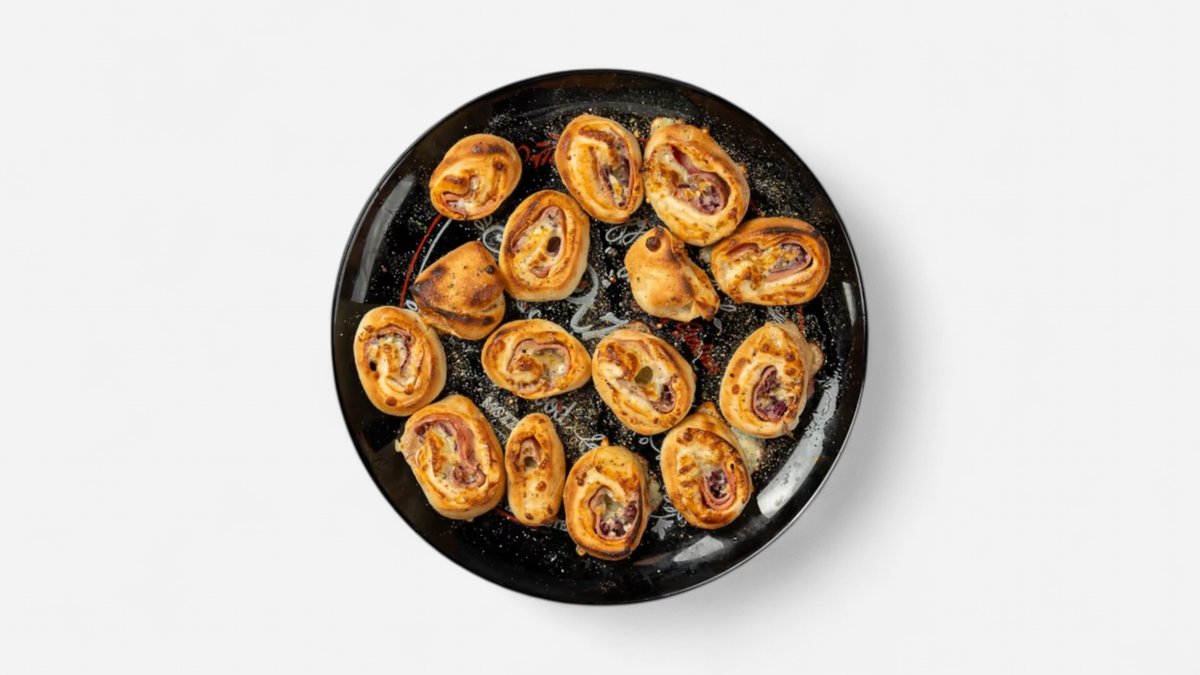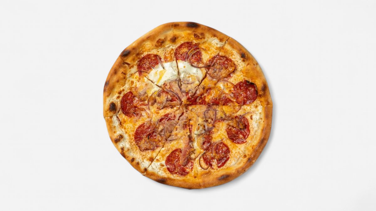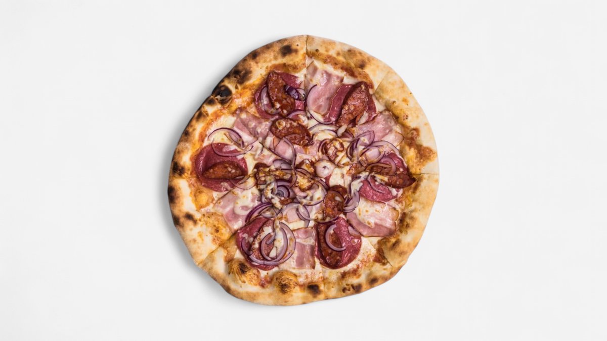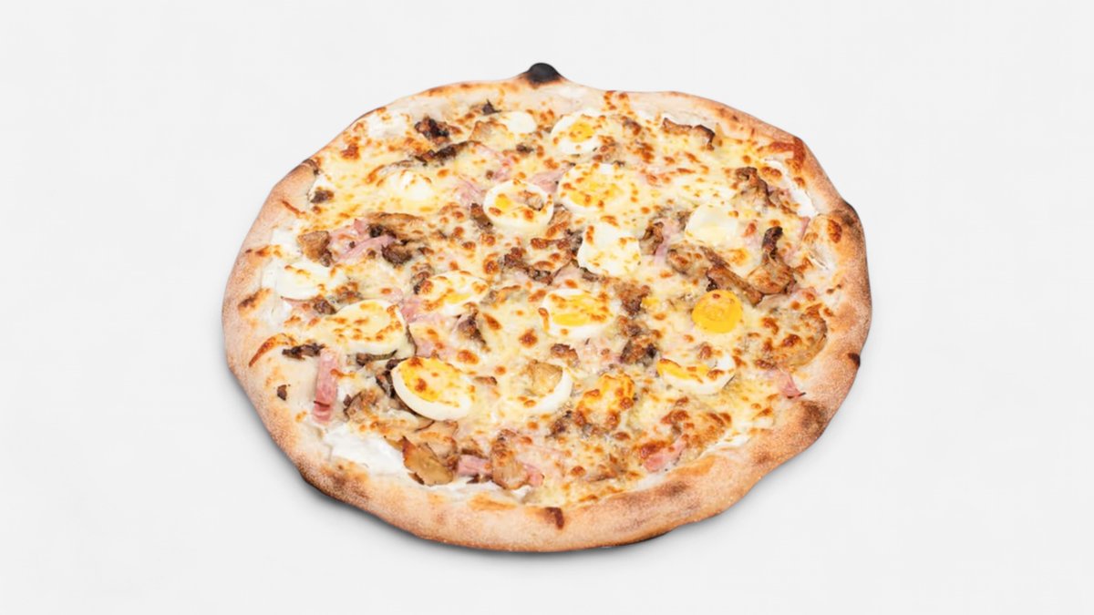 cesto, smotanový základ, mozzarella, chorizo, slanina, vajce, červená cibuľa, parmezán 710 g / obsahuje: 1, 3, 7