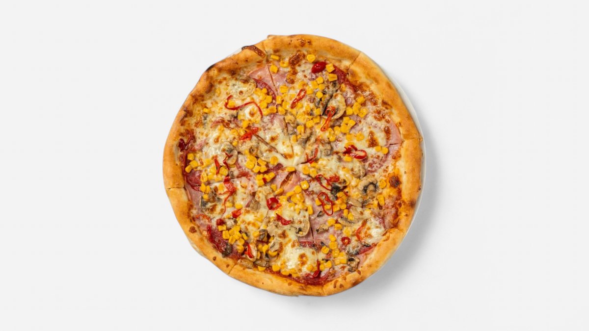 cesto, paradajkový základ, mozzarella, šunka, slanina, saláma, šampiňóny, kukurica, feferóny 810 g / obsahuje: 1, 7