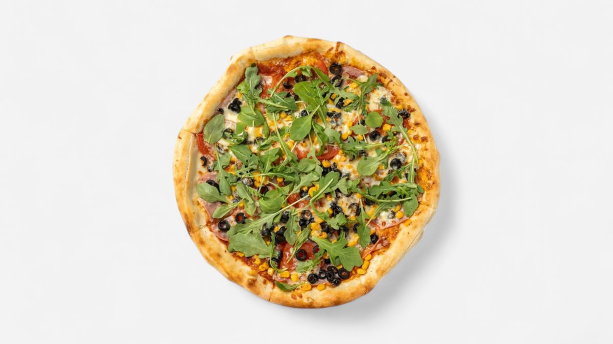 cesto, paradajkový základ, mozzarella, šunka, slanina, olivy, kukurica, rukola, paradajky 810 g / obsahuje: 1, 7